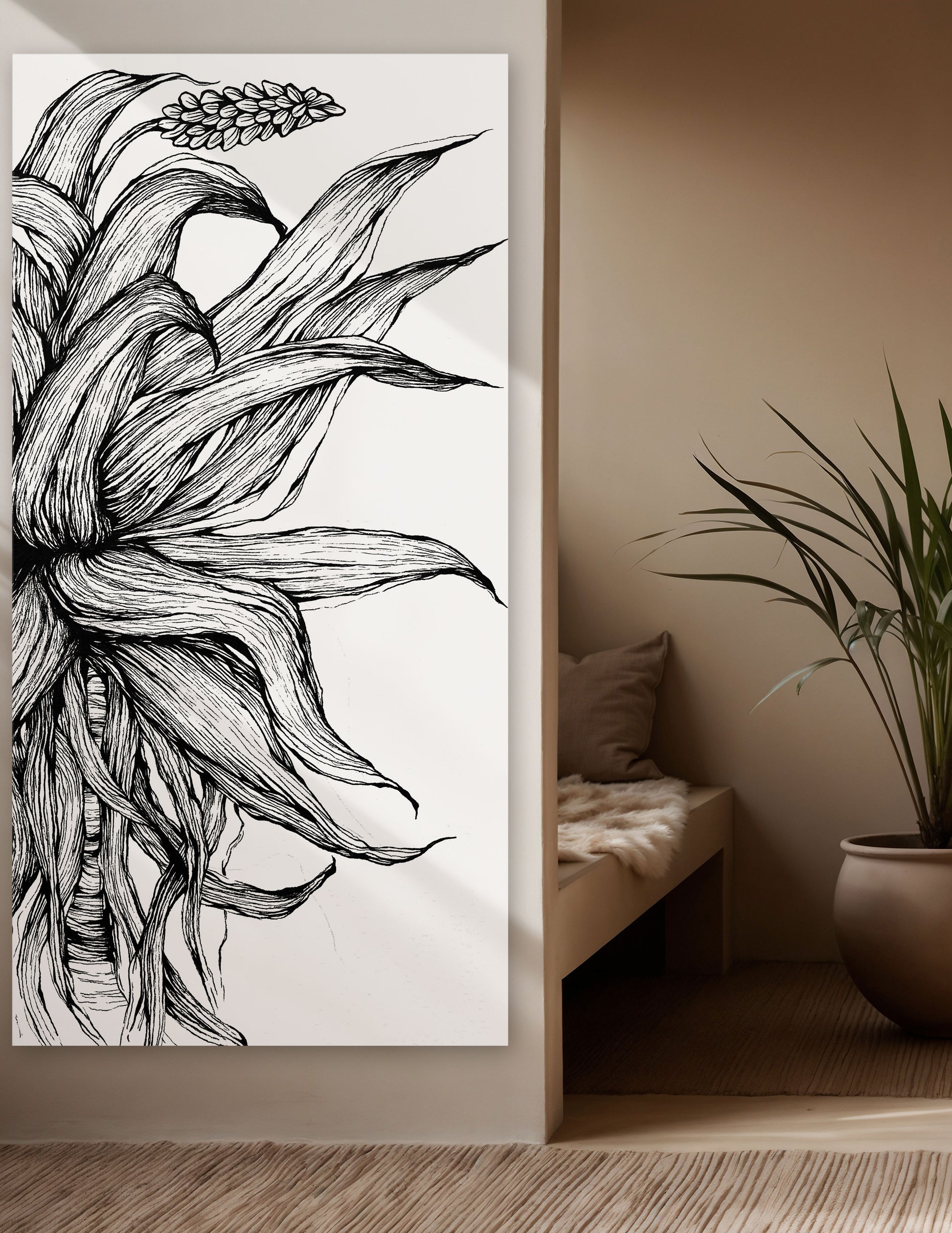 Lovingly created by Lusted & Lamb, this simplistic yet dramatic art piece showcases a aloe plant in black line art on stark white.