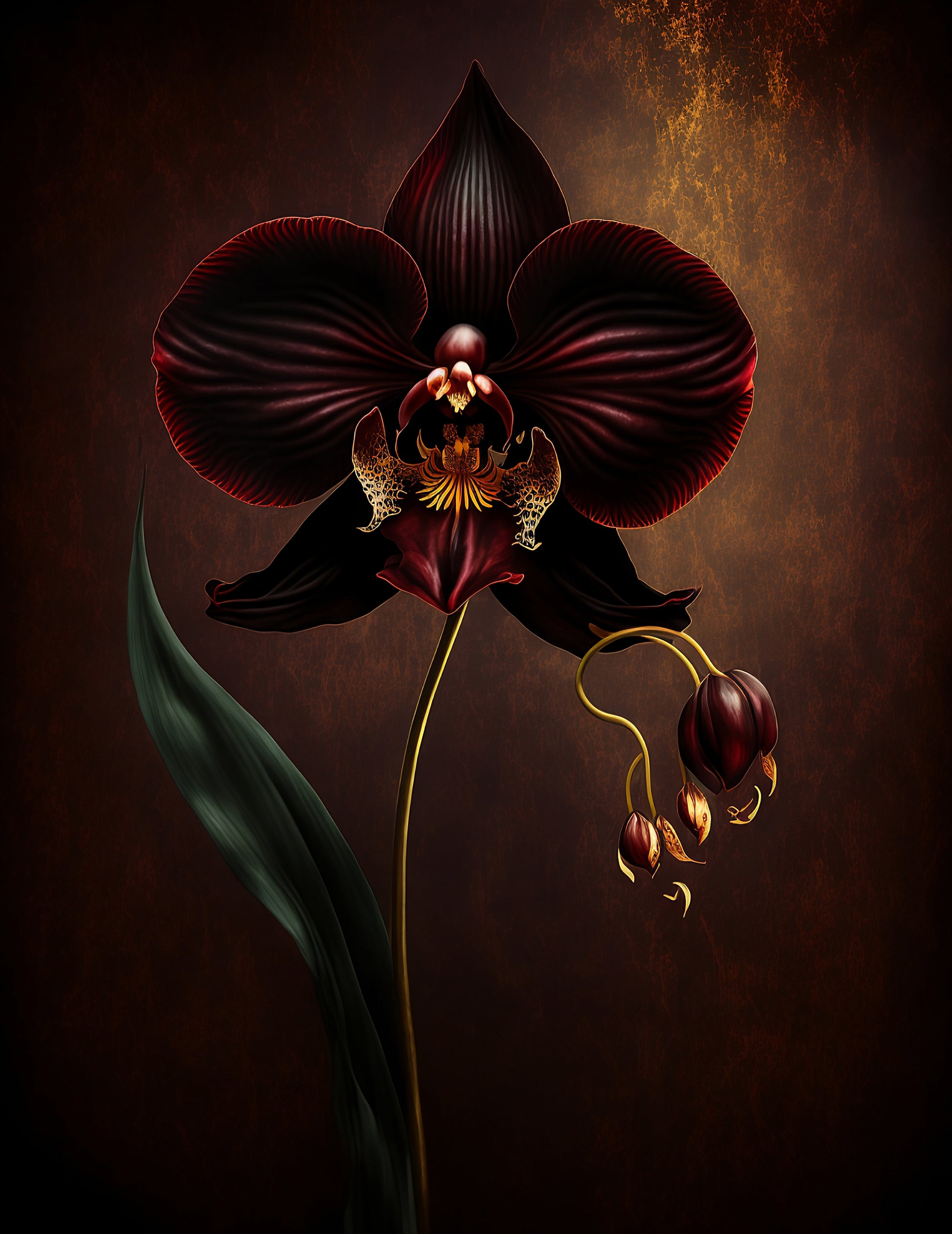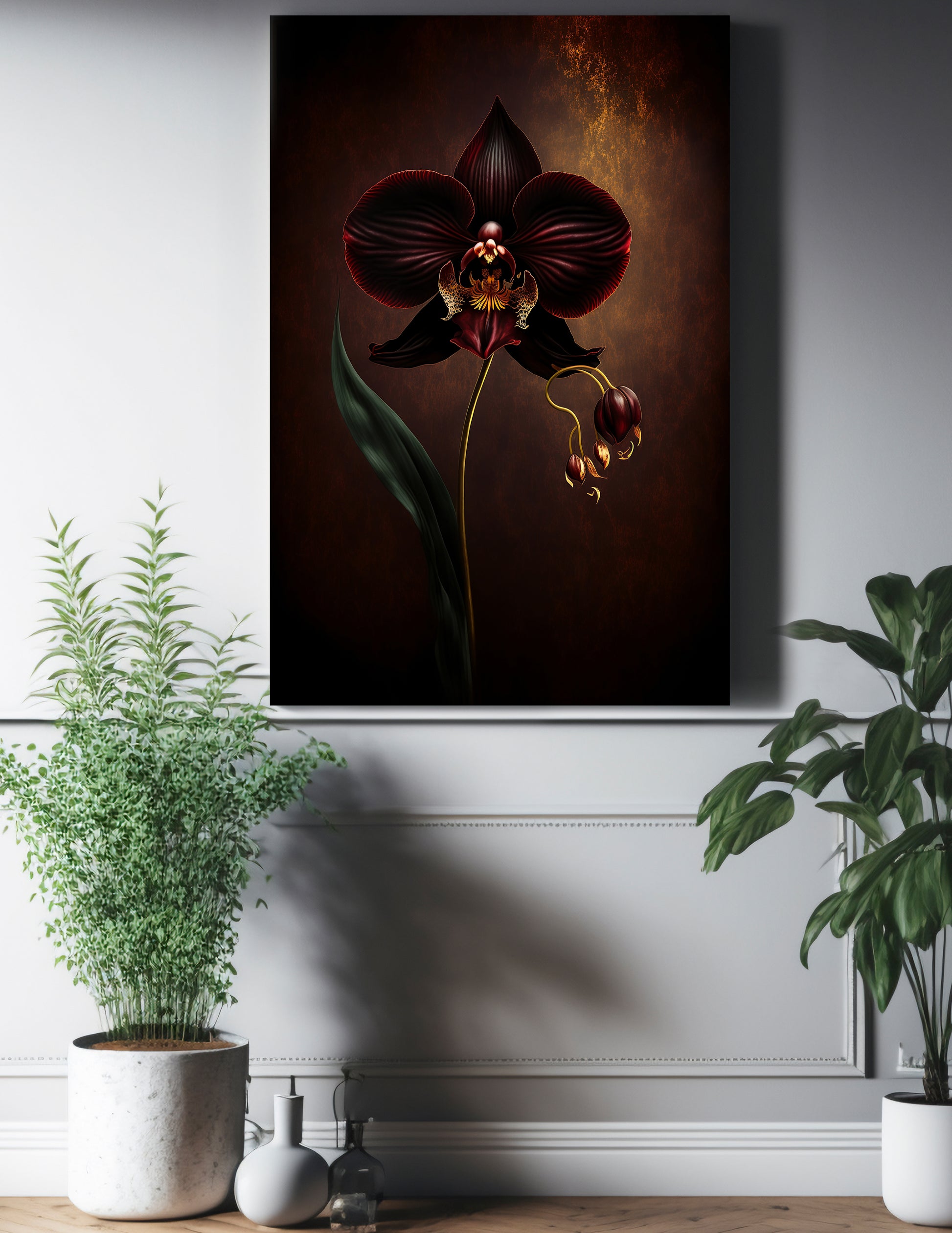 Dramatic dark red floral art piece.