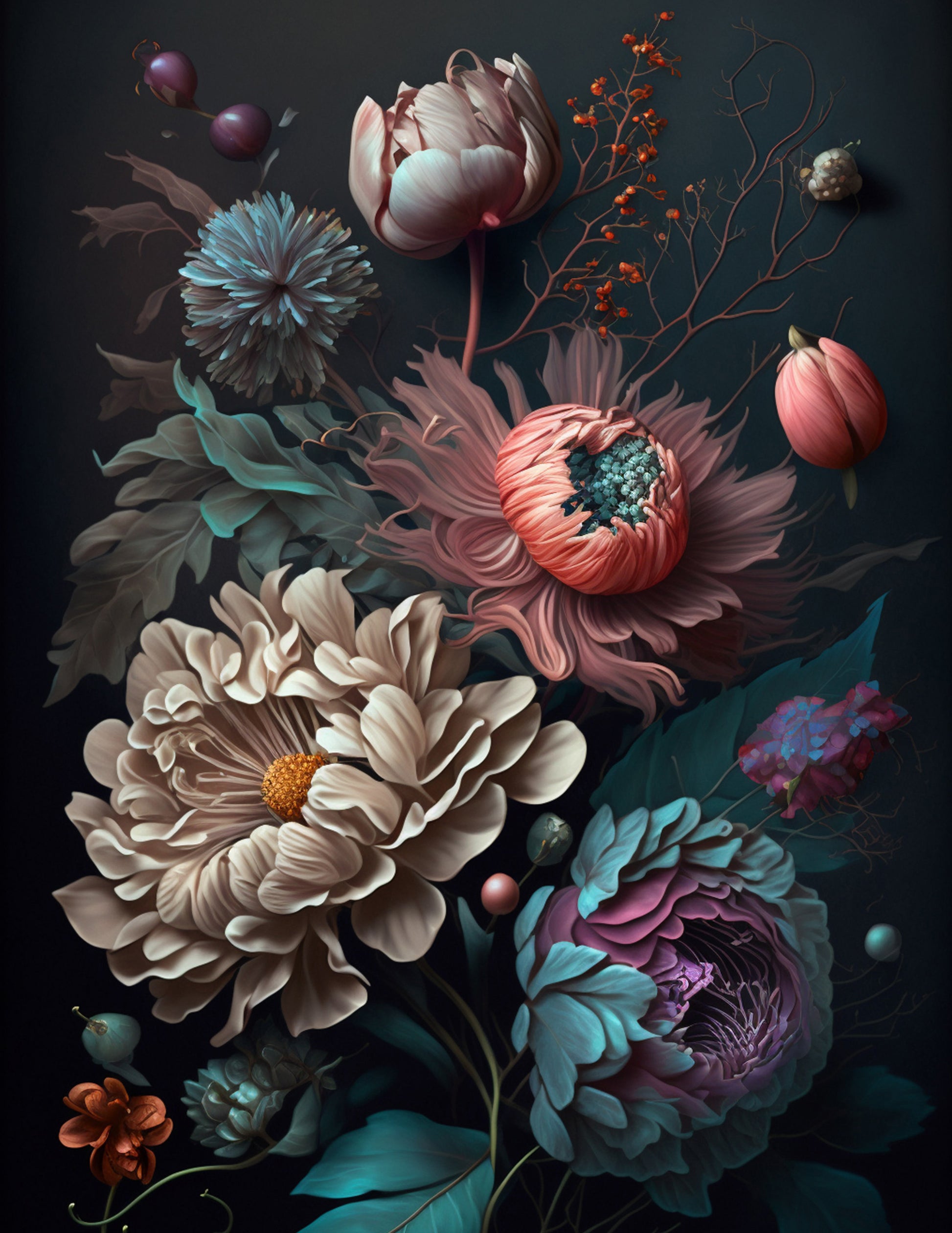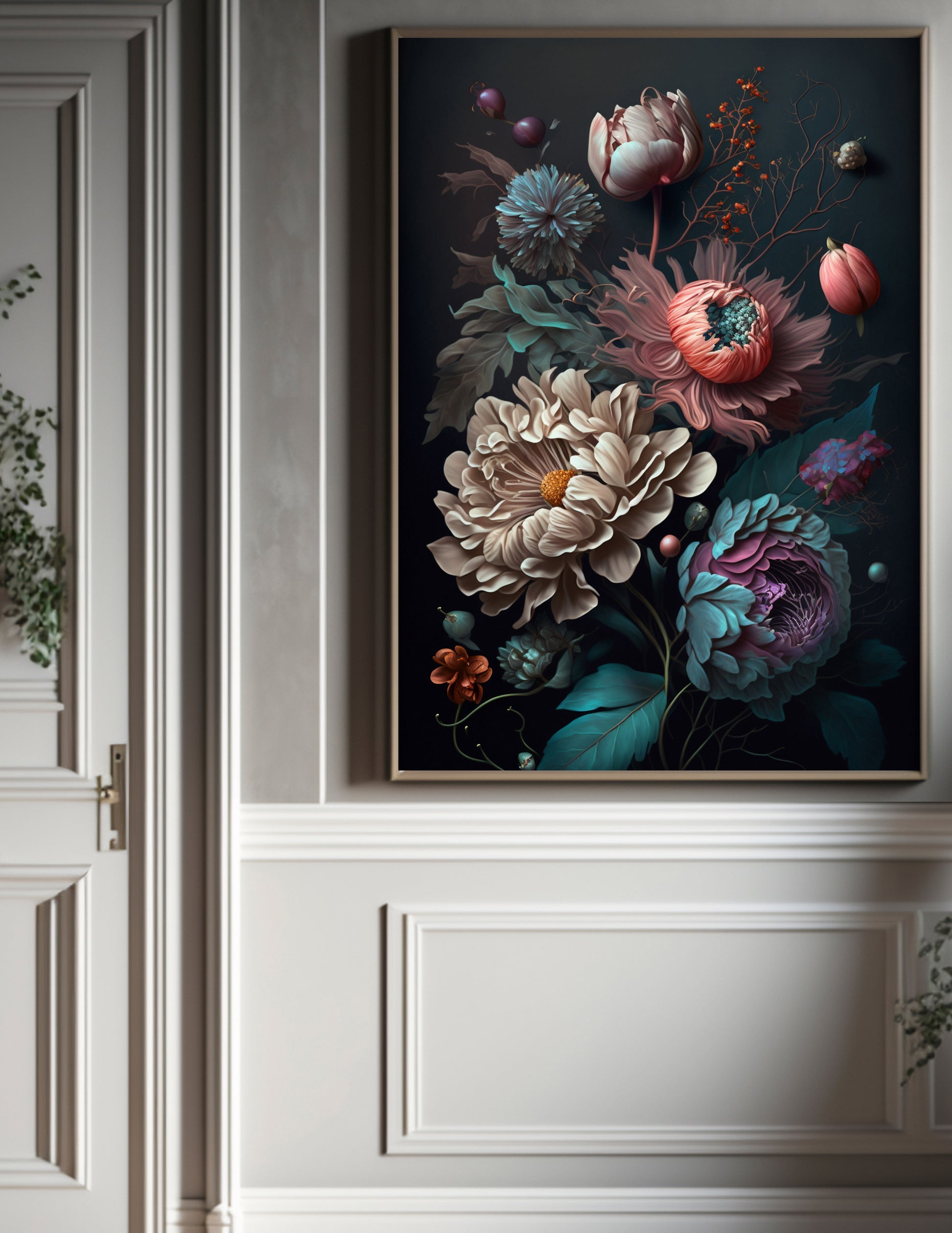 Colourful, dramatic floral art print, sure to create a striking focal piece in your home.
