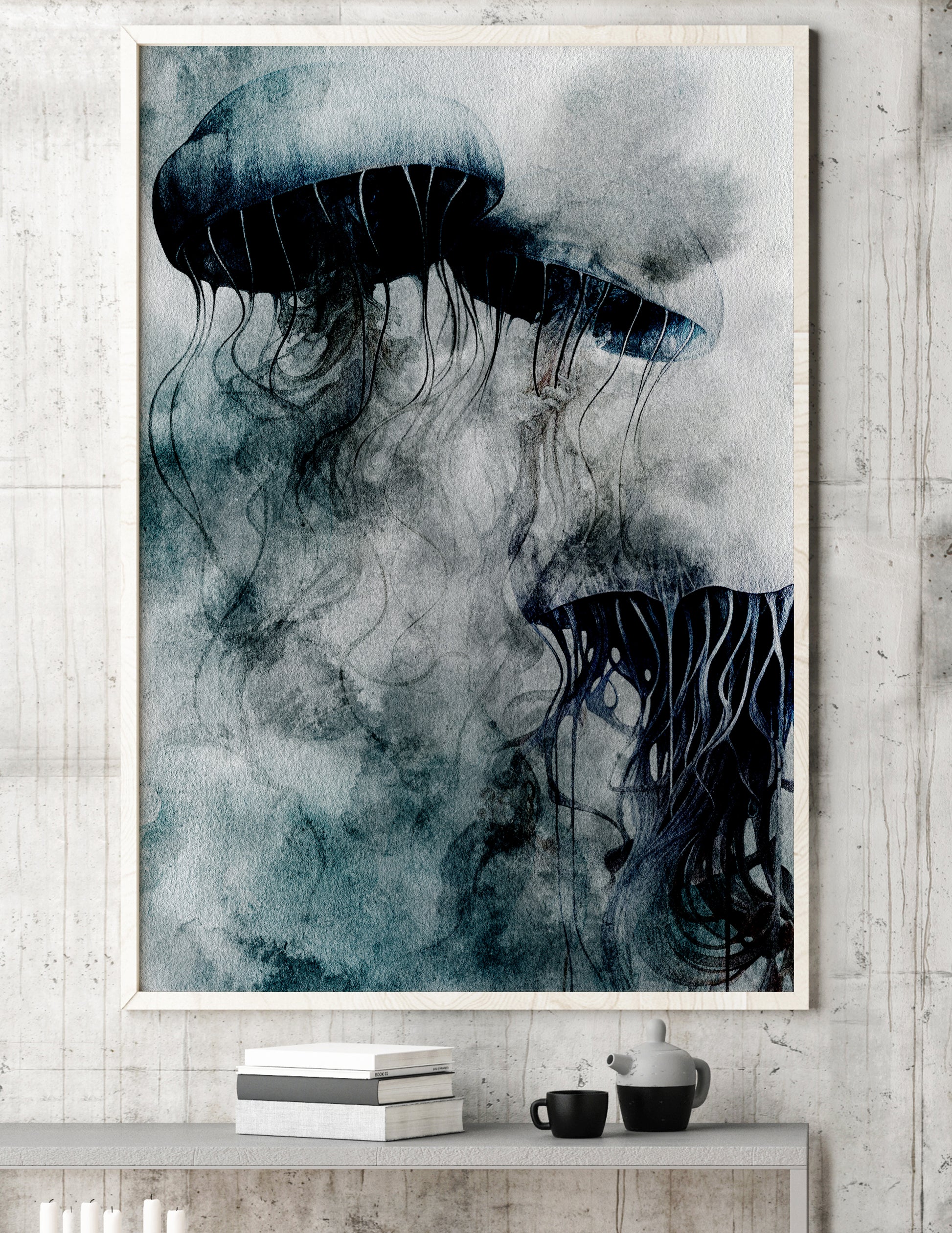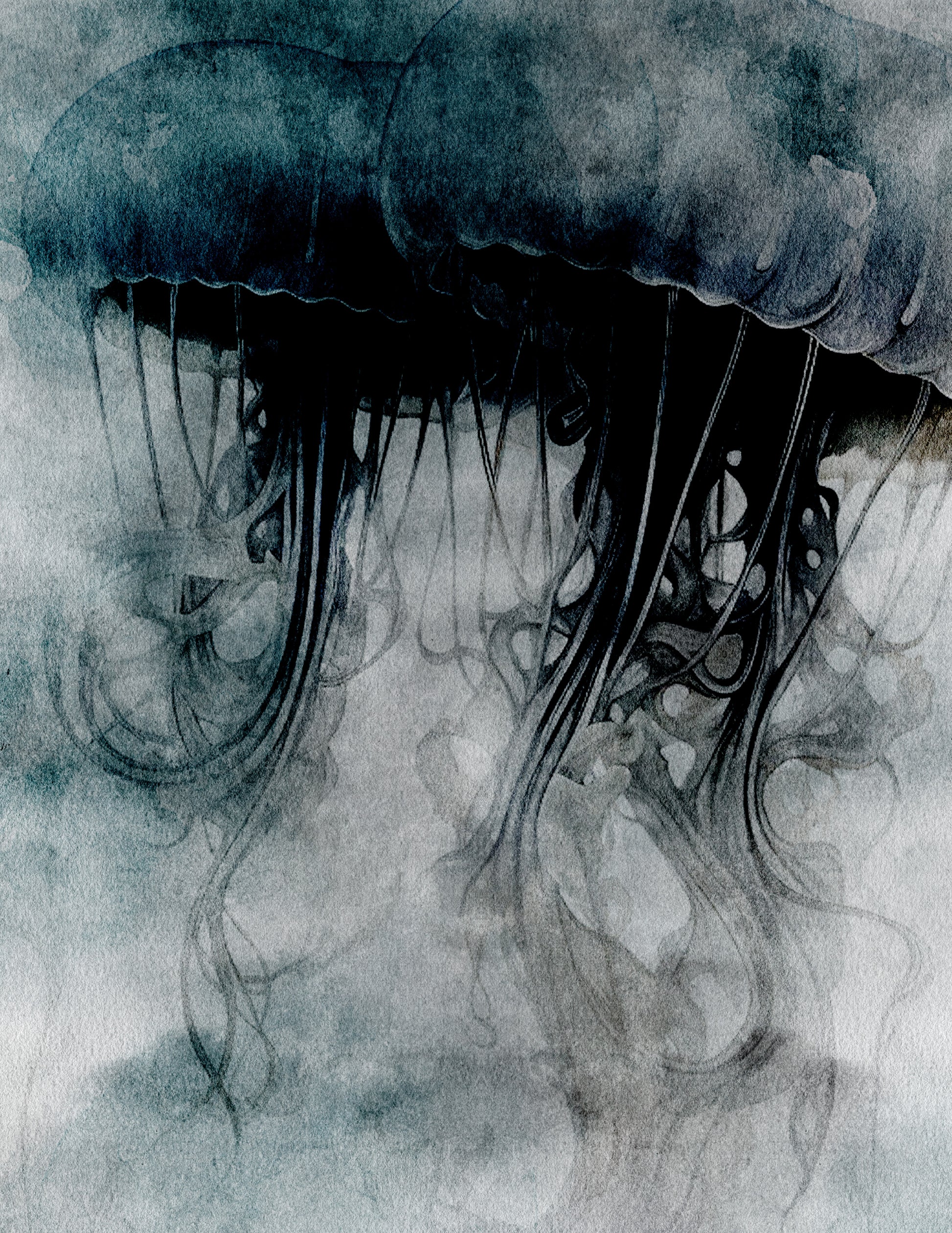 Dramatic underwater piece of abstract flowing Jellies in blue, grey and black tones.