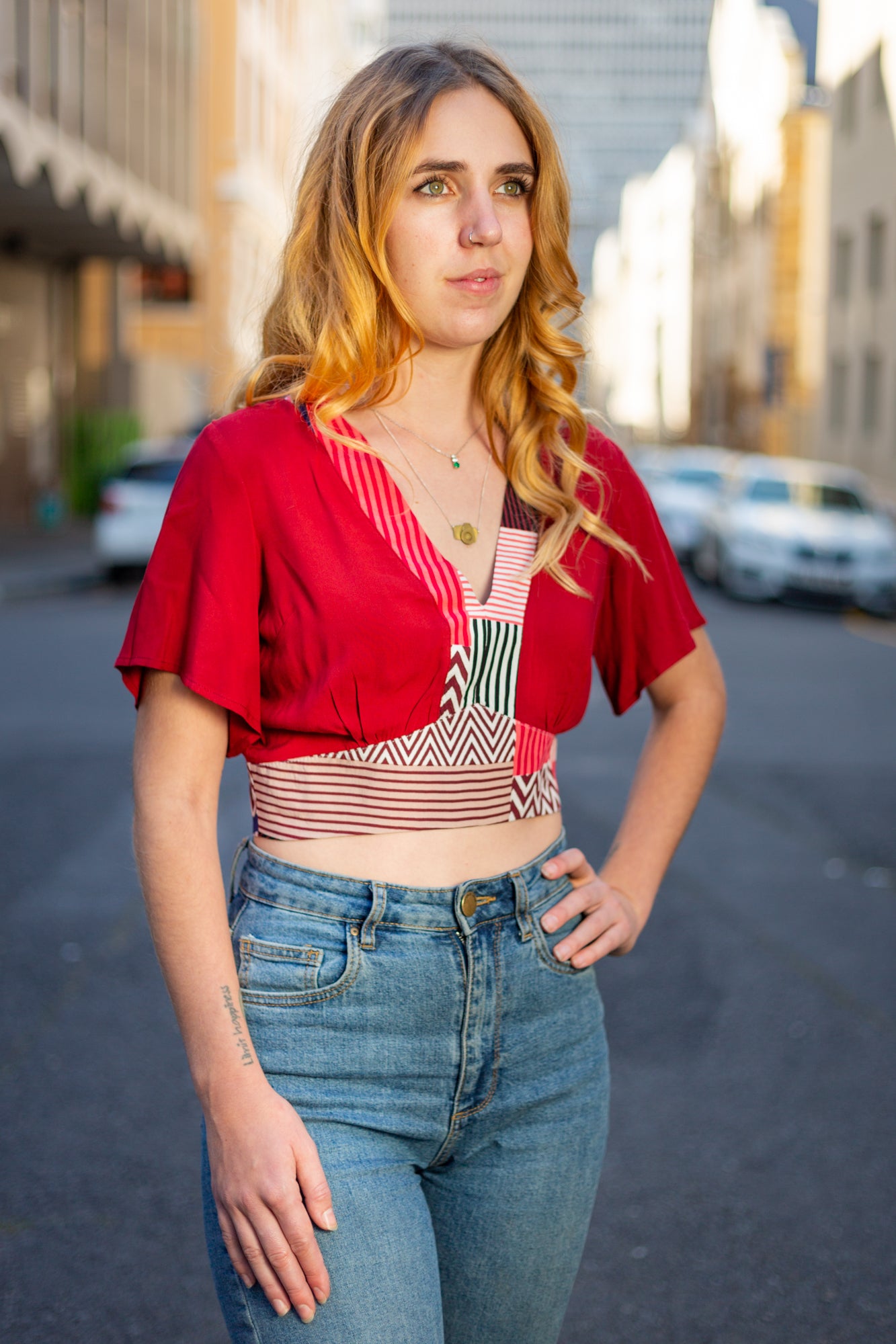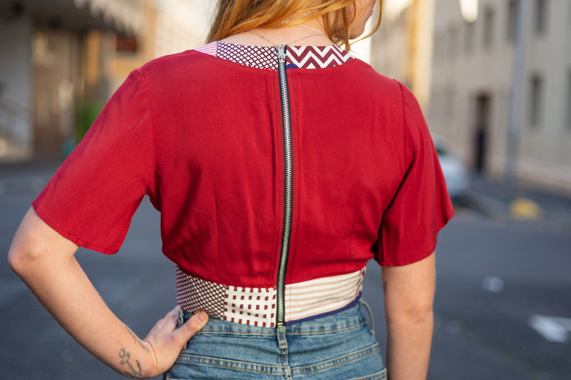 A beautifully crafted red crop top with abstract panelling detail. Exposed zip at the back for a refined look. Only 3 produced.