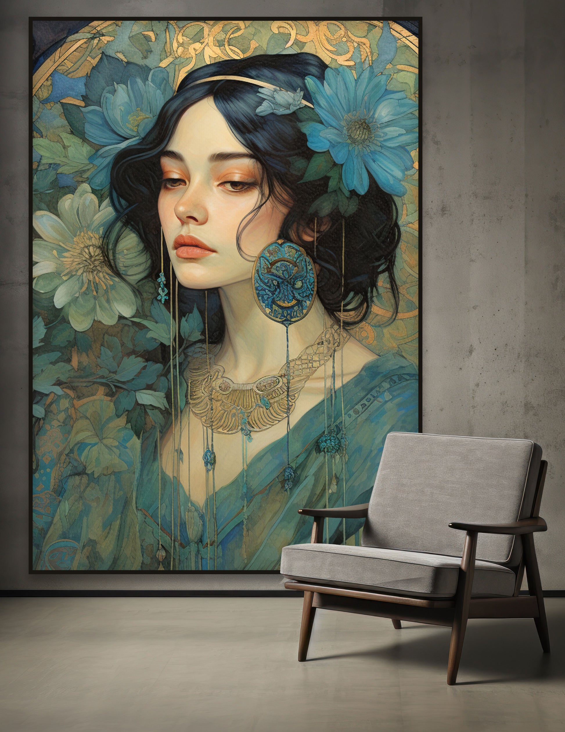 Art Nouveau inspired portrait of a woman in tones of blues and golds.