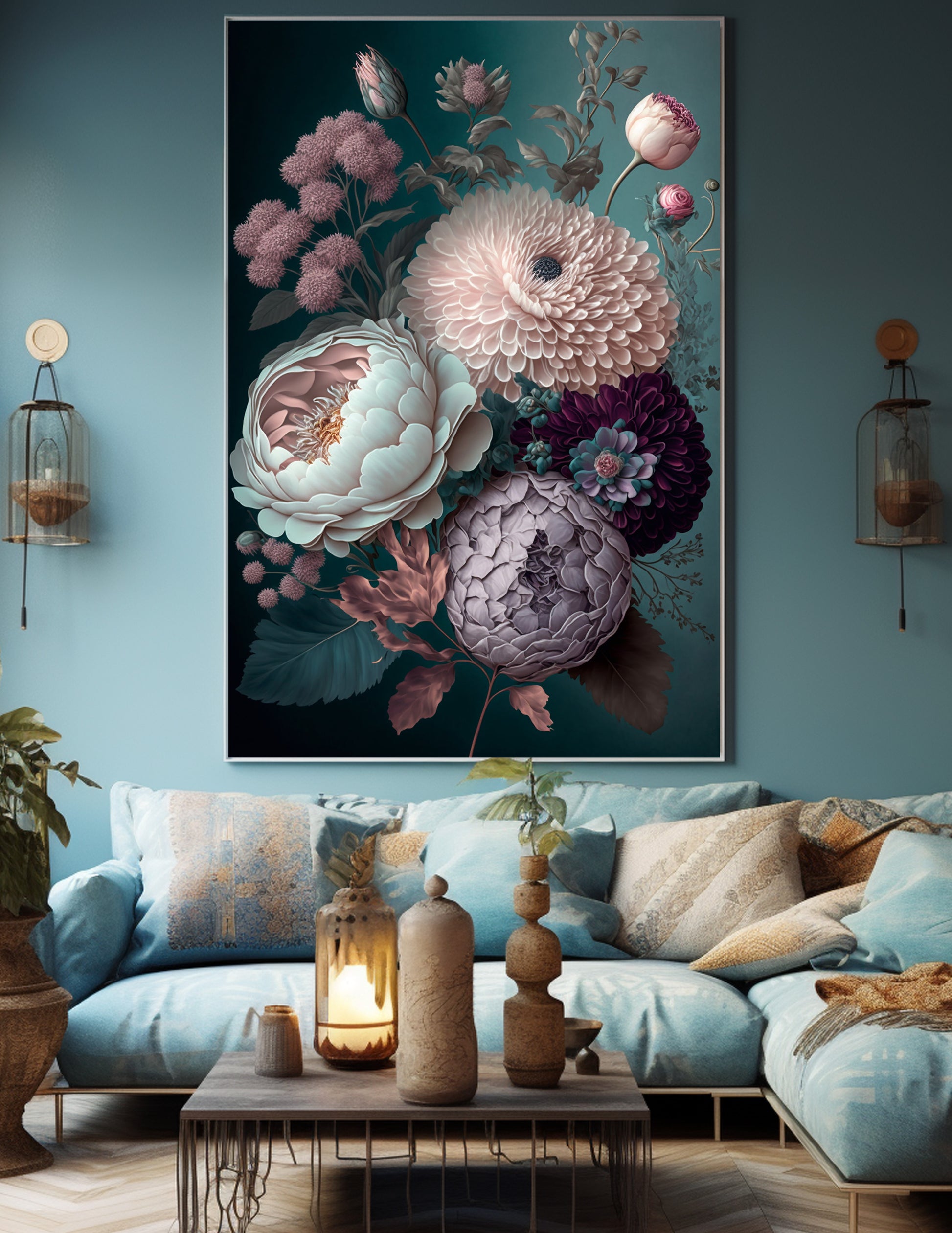 - Stretched, block mounted canvas, framed or unframed.