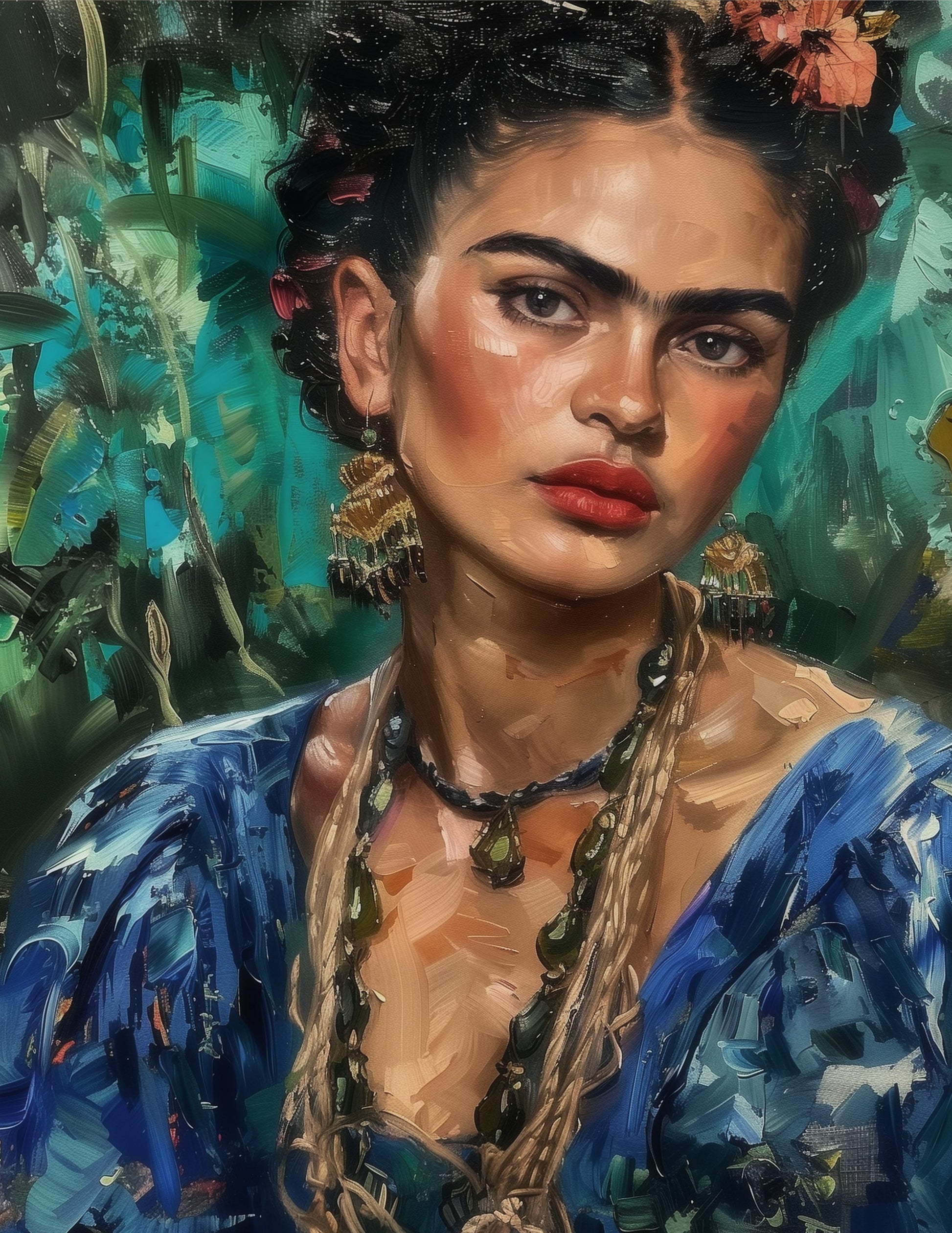 Bohemian Portrait of Frida Kahlo in tones of vintage blue and greens.