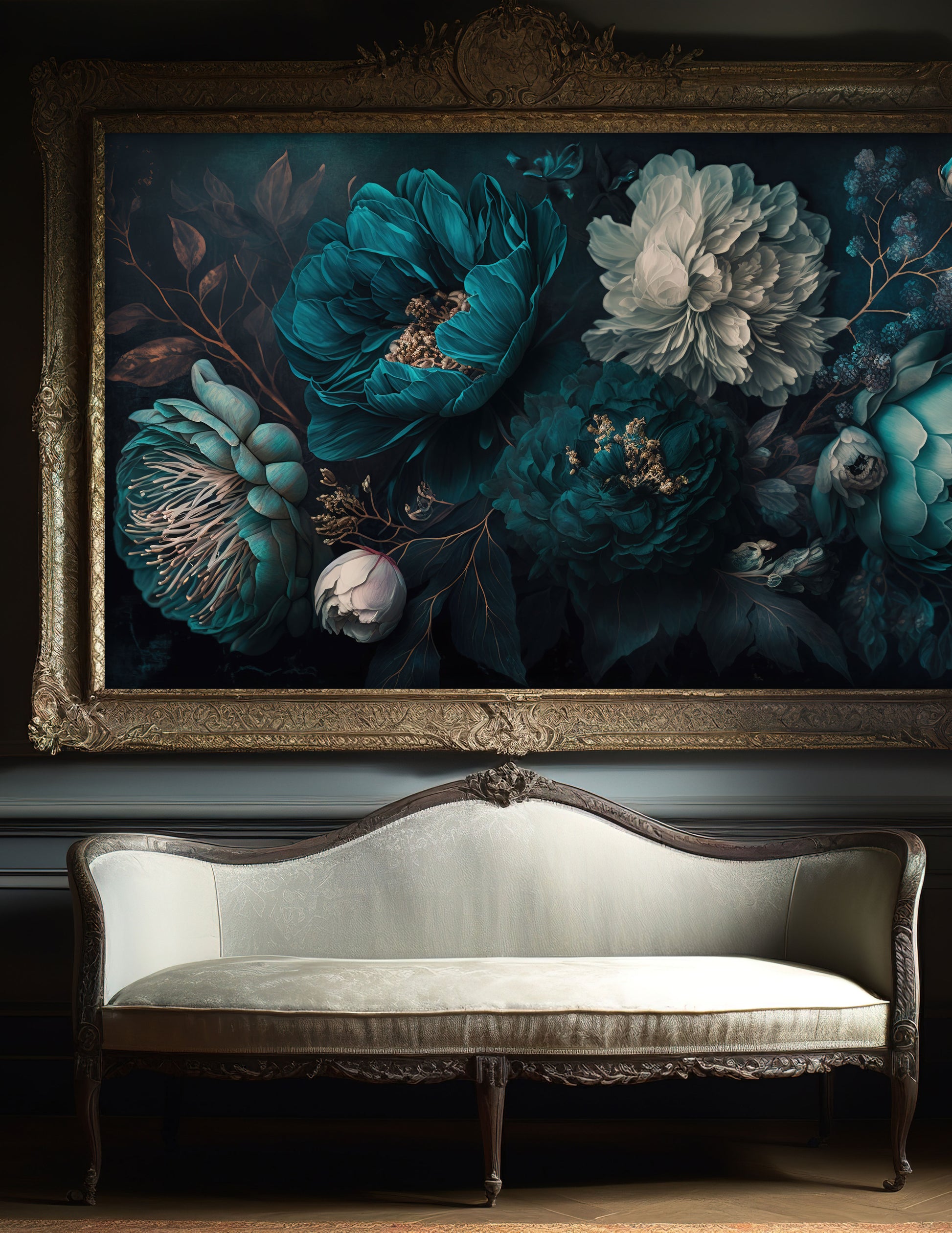 Soft portrait of florals in unusual tones of vintage blue/greens for a dramatic centerpiece.