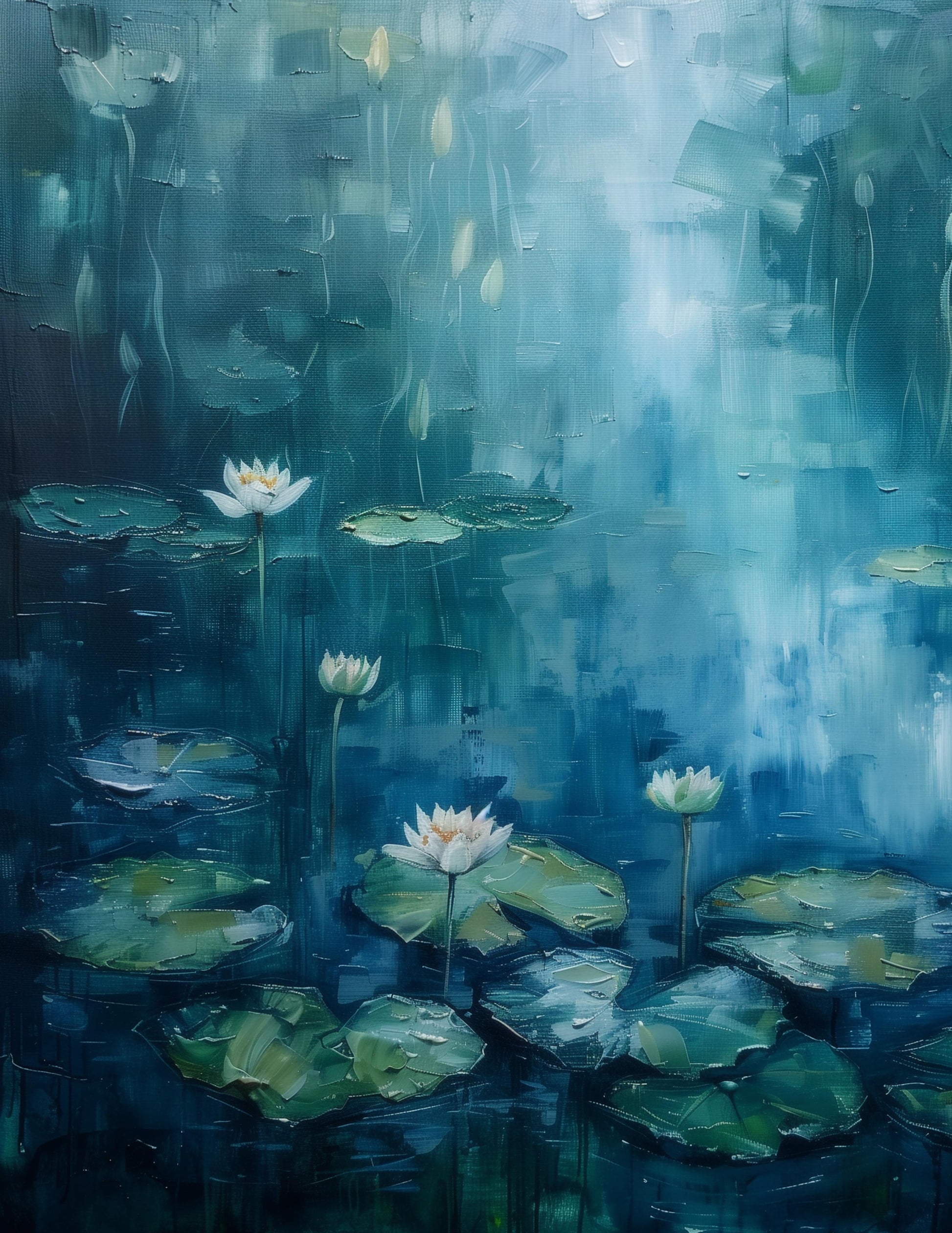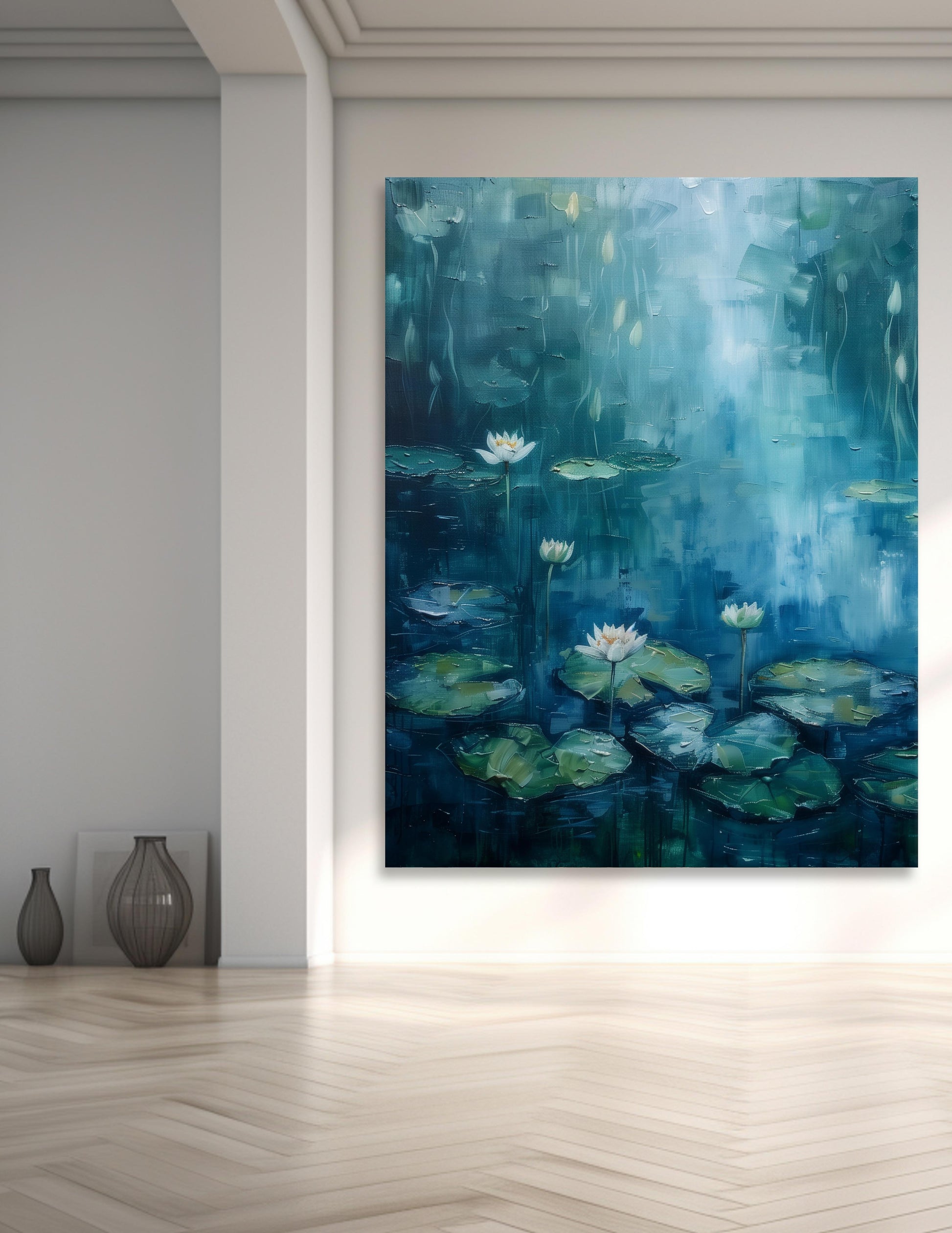 Bohemian Waterscape of Lily Pond in tones of vintage blue and greens.