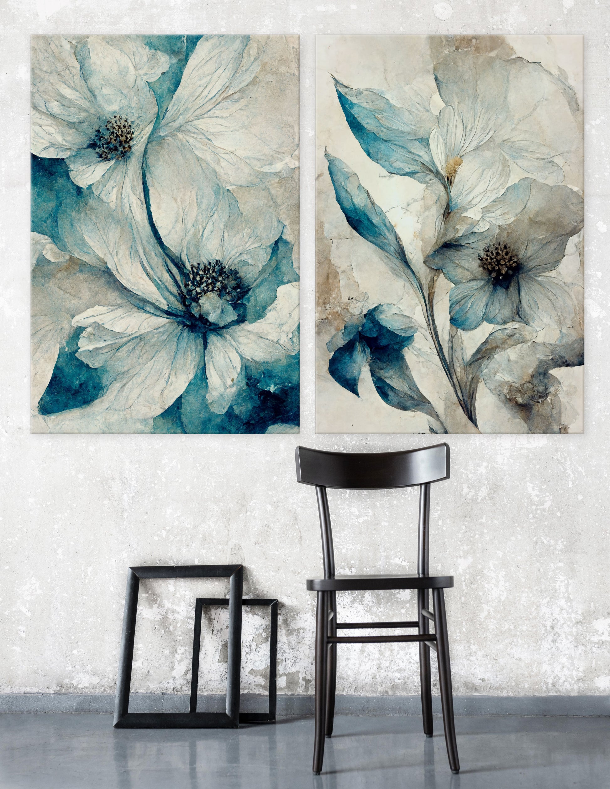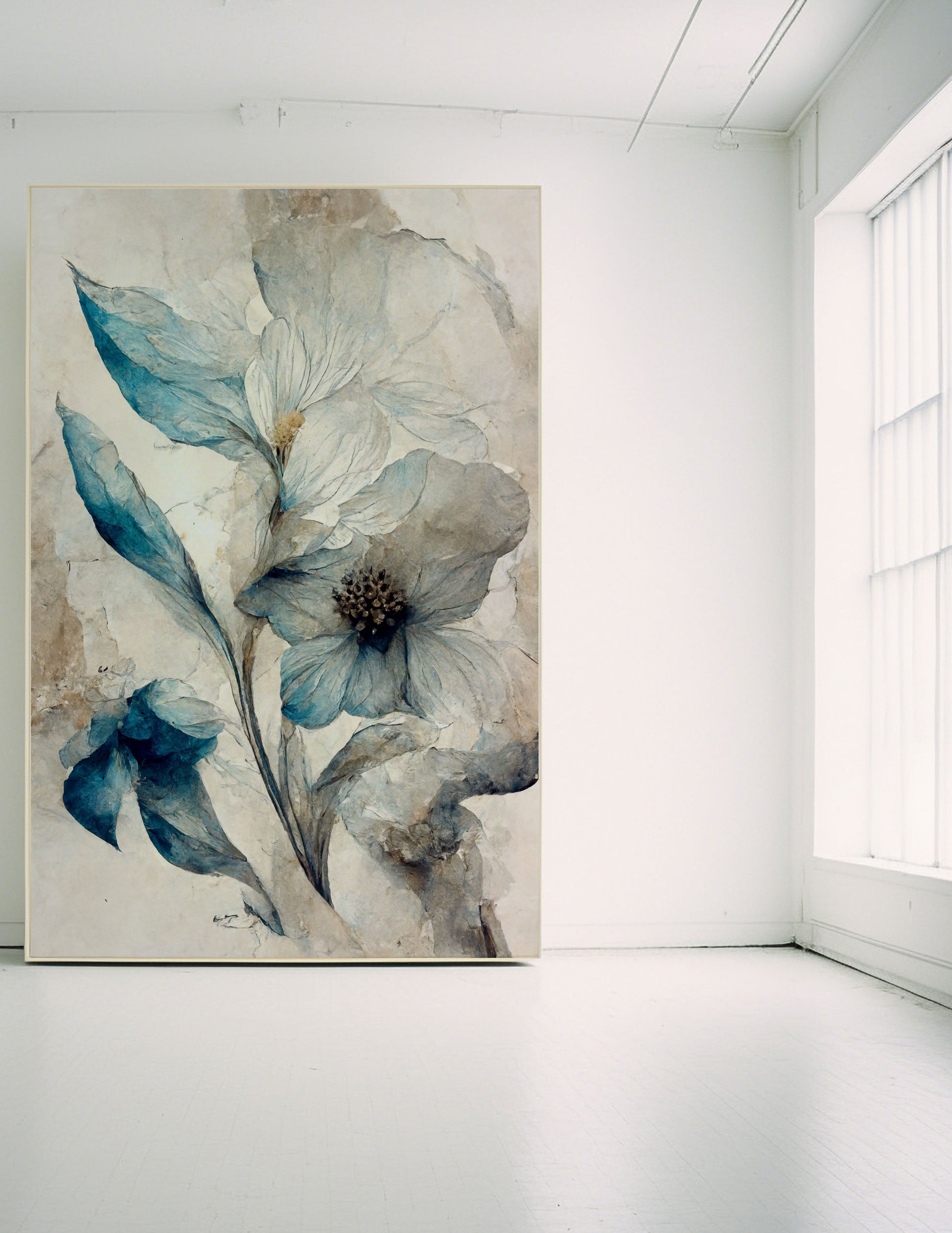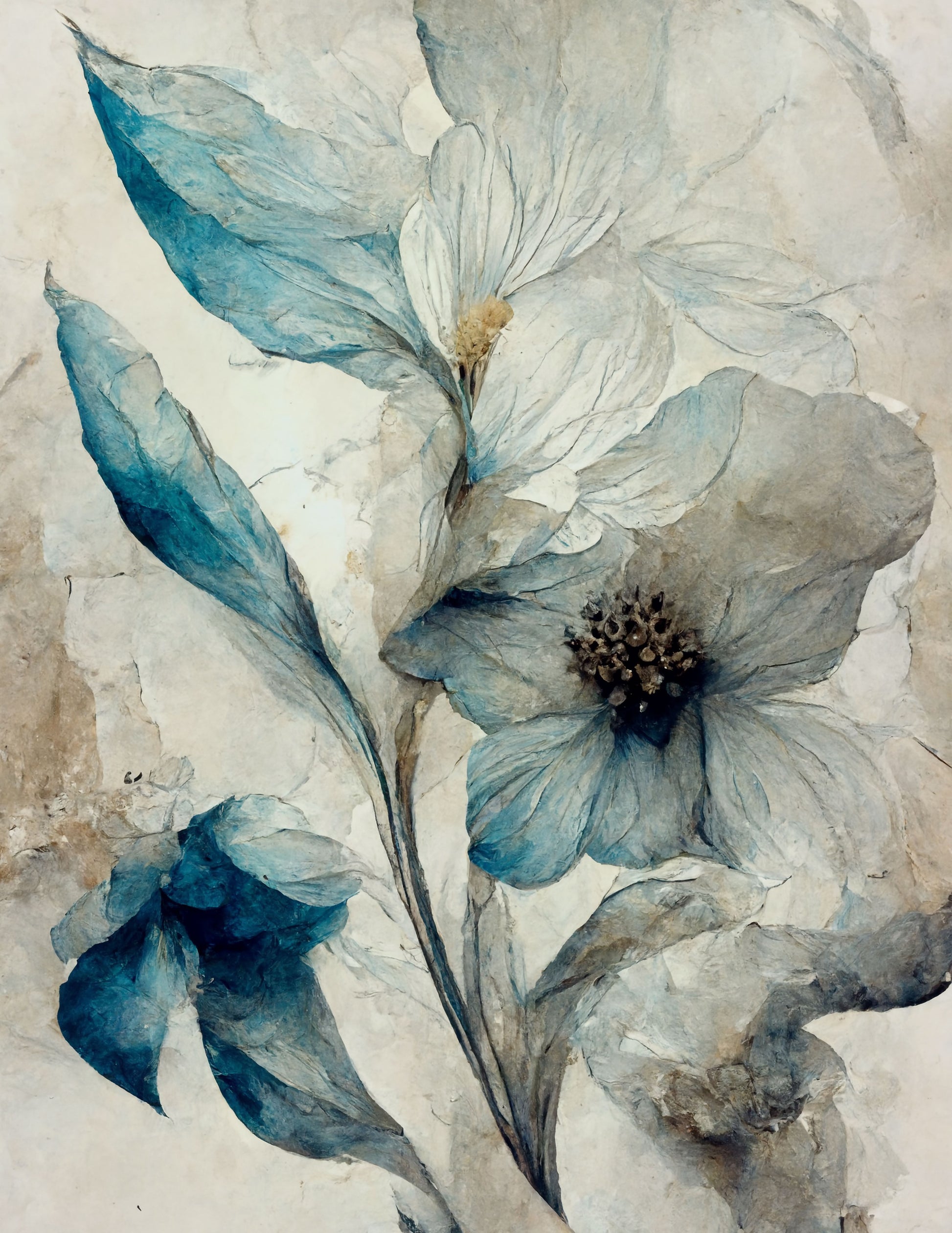 Soft white and blue florals on a cream textured backdrop.