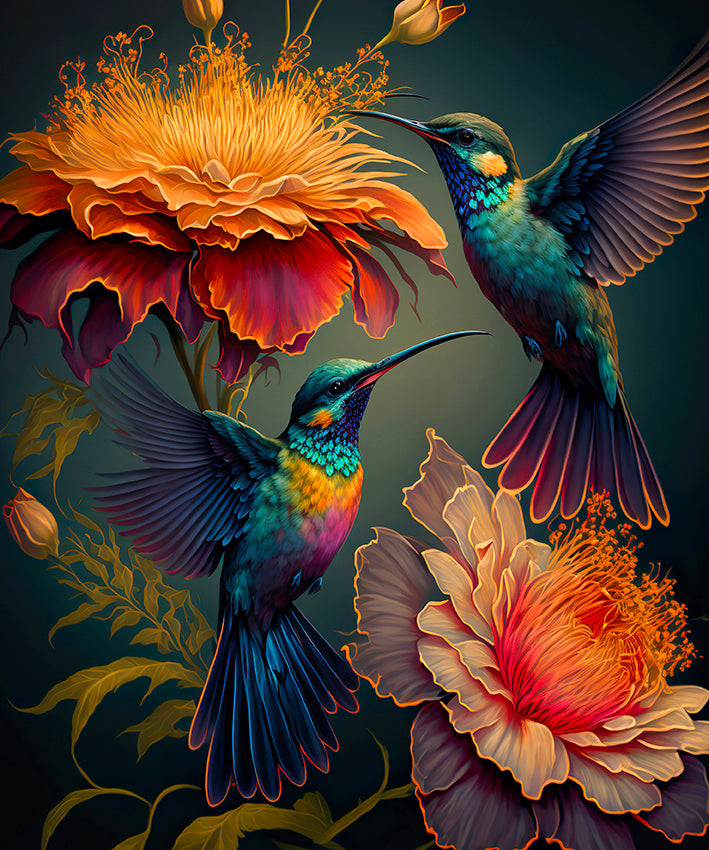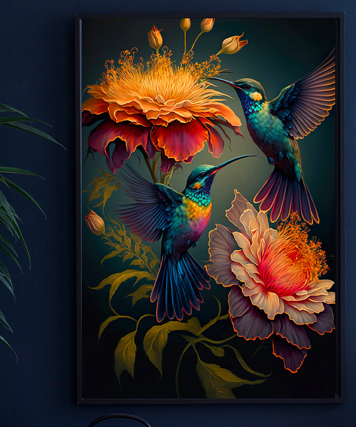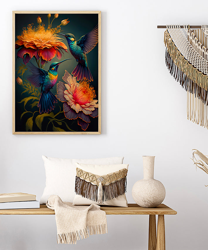 Striking bohemian print of Sunbirds in a tropical scene.