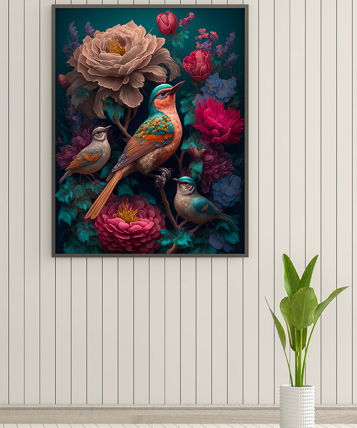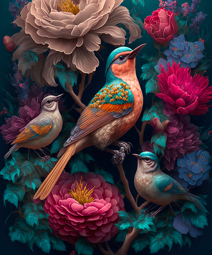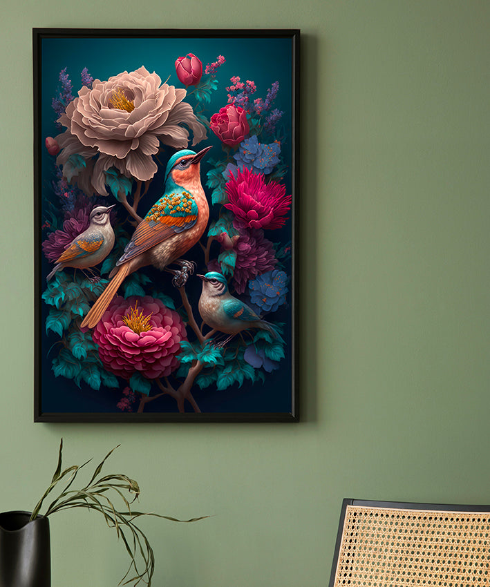 Striking bohemian print of birds in tropical scene.