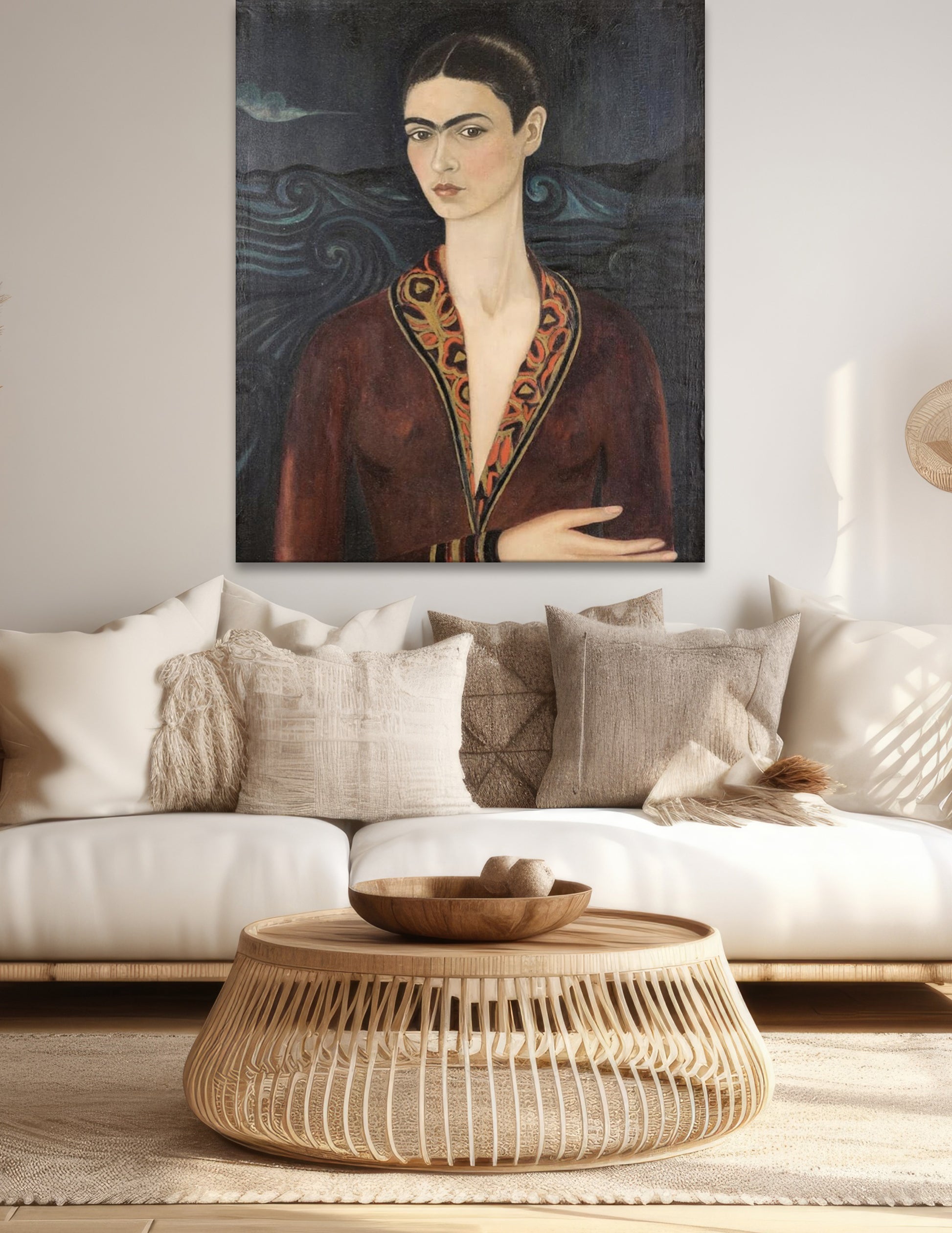 Dramatic Bohemian art piece of Frida Kahlo in tones in blues & greens.