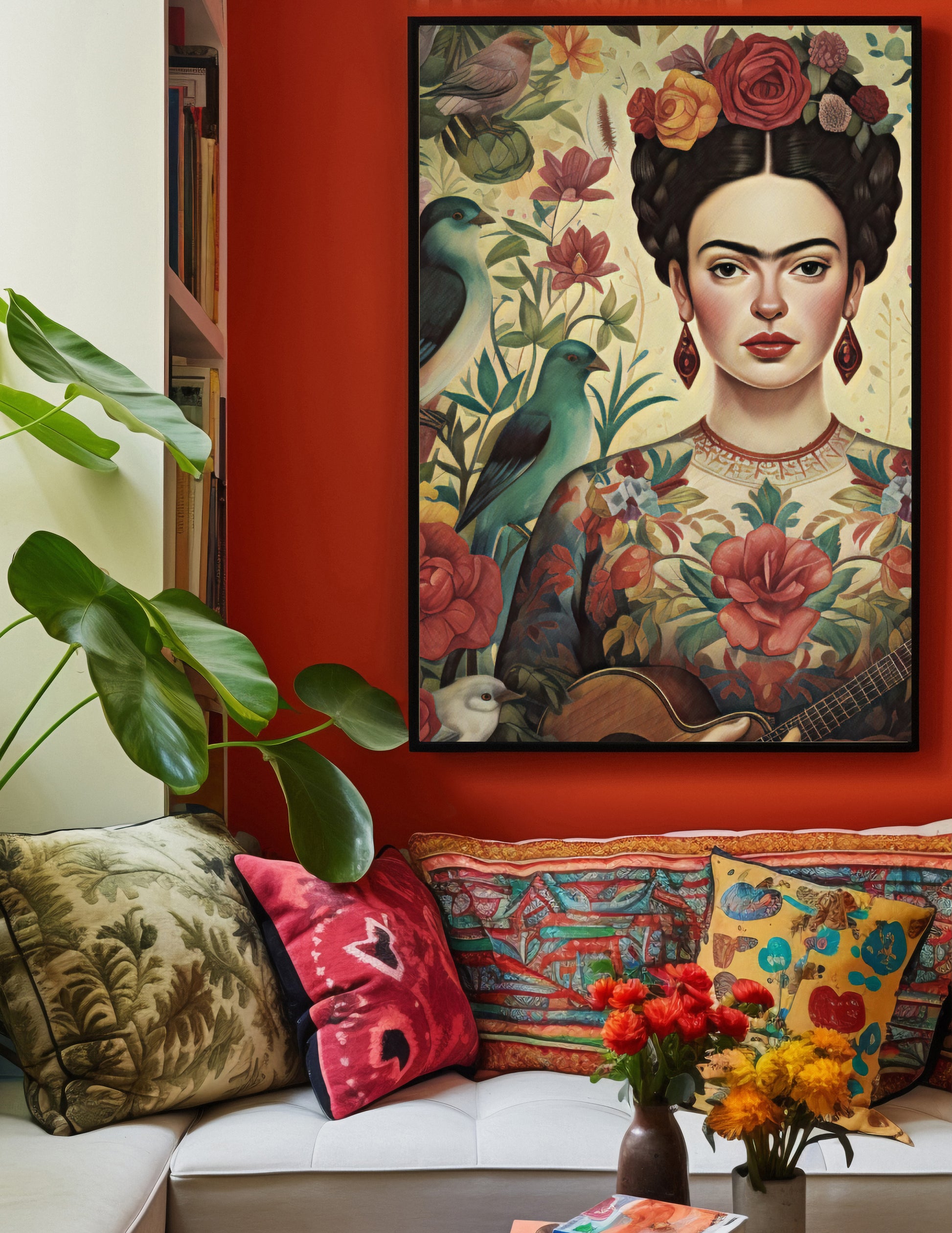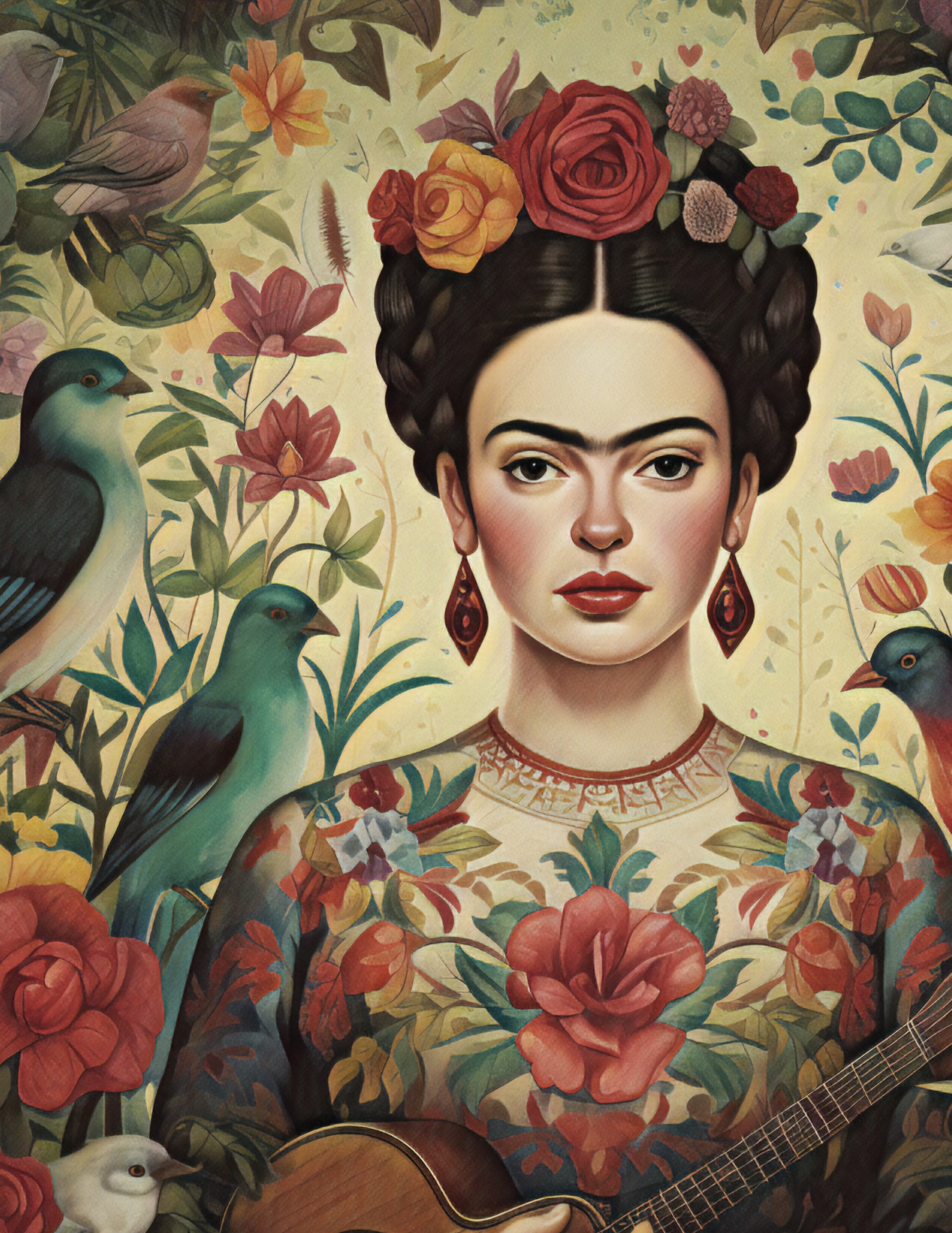 Rich Bohemian art piece of Frida Kahlo in floral garden with birds.