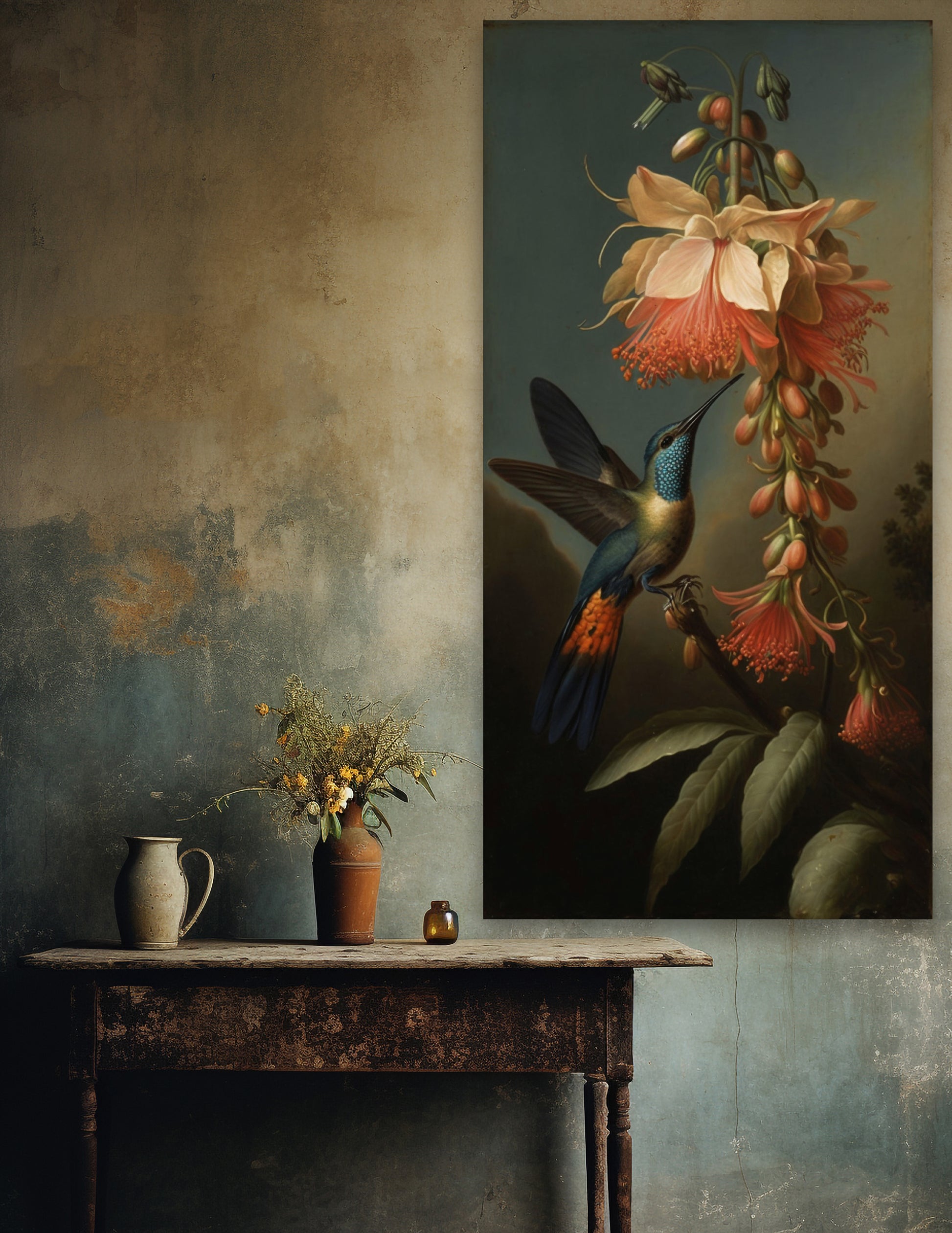 Vintage portrait of hummingbird hovering by flowers.