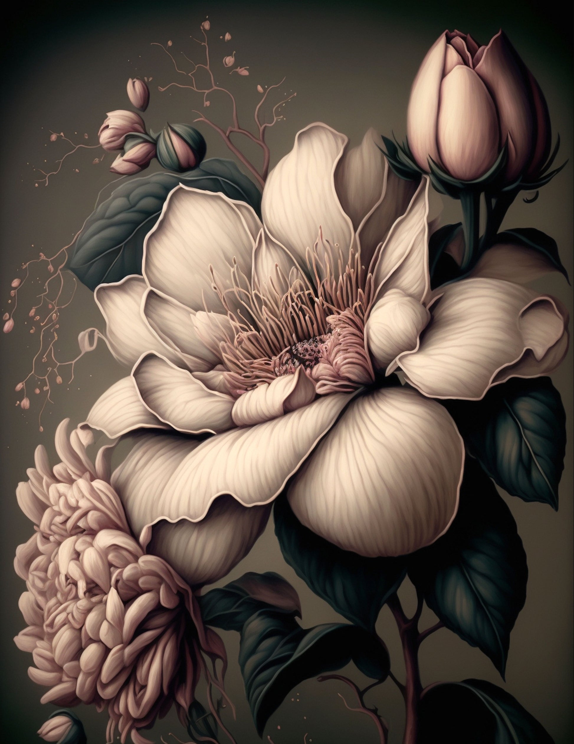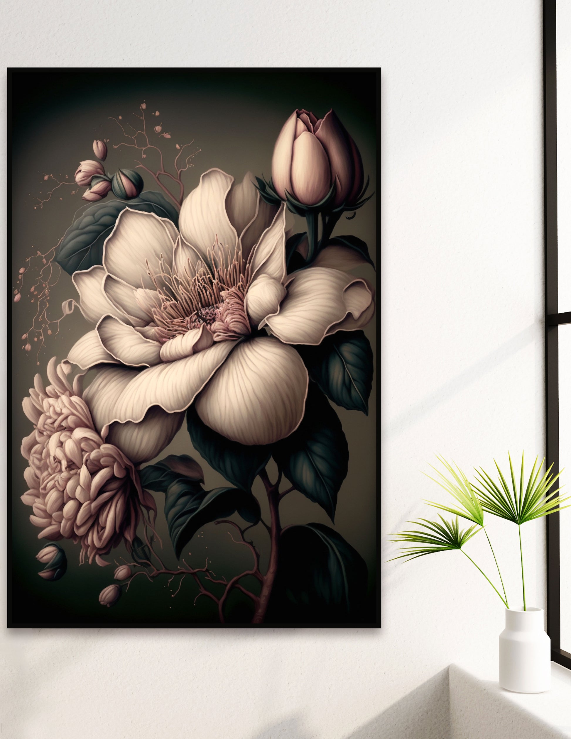 Stylised portrait of florals in monotone colouring
