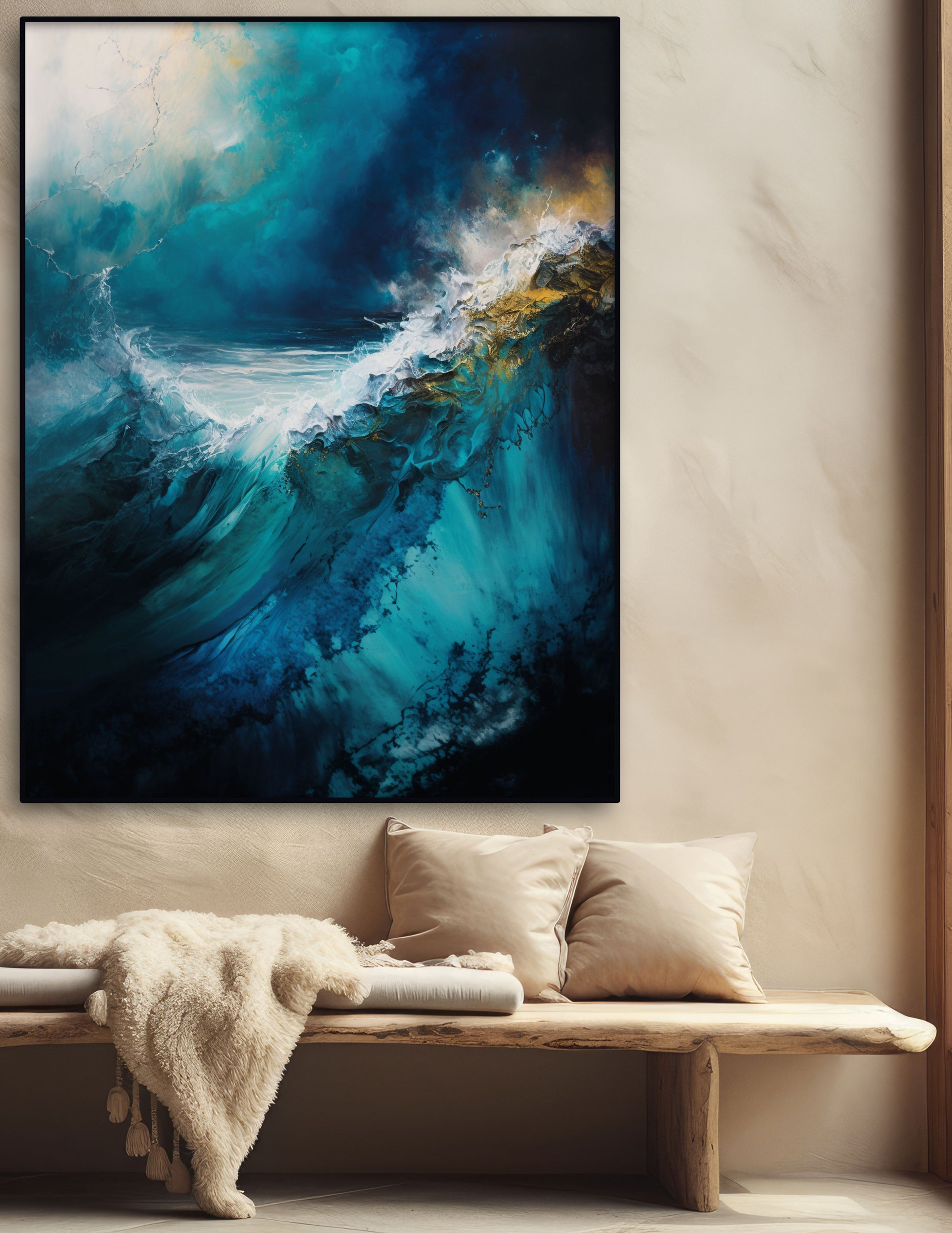 Abstract art piece, inspired by the ocean, set in rich colours of blue with a hint of gold.