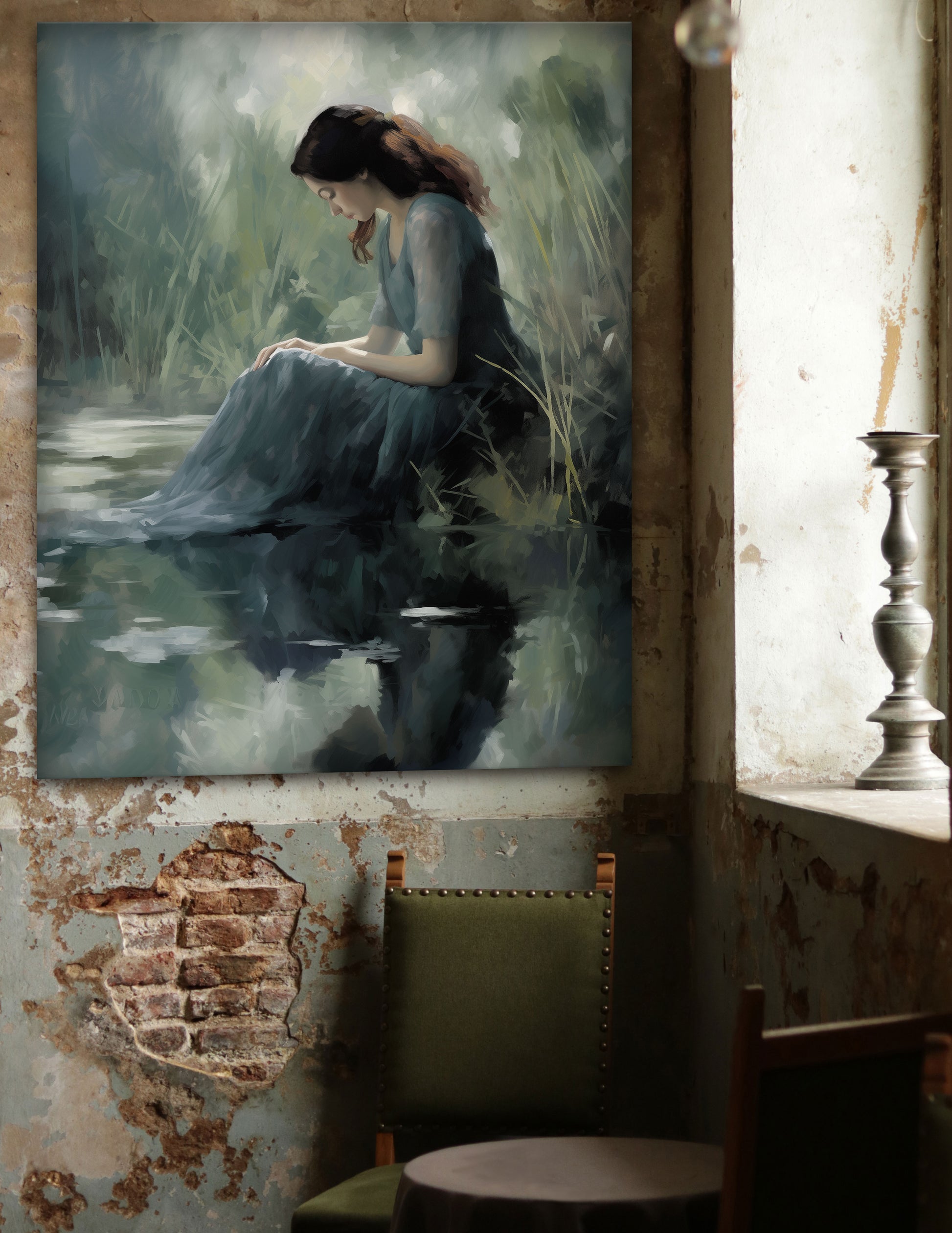 Impressionist inspired portrait of a Woman sitting by a pond, in tones of vintage blues and greens