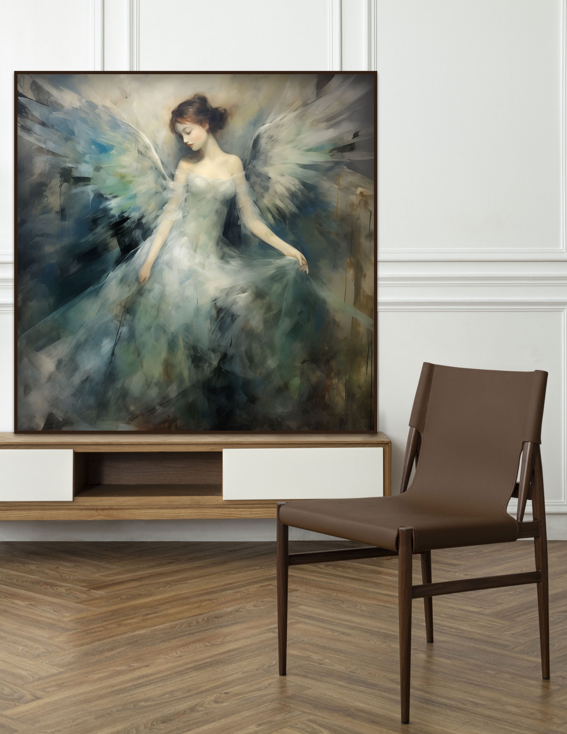 Inspired by the Impressionist art style, this Vintage Bohemian art piece of an Angel is set in soft tones of blues and greens.