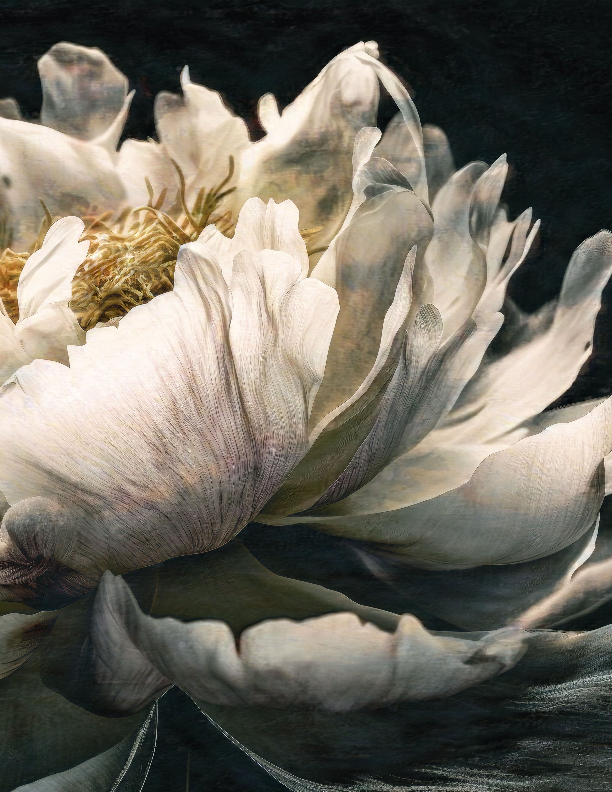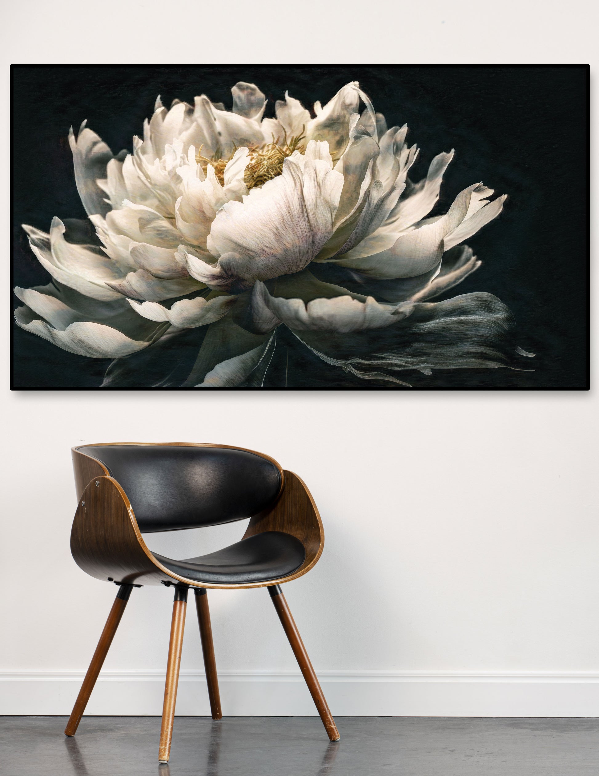 This bold and dramatic floral would create a strong focal point in any room. In tones of whites set on dark background