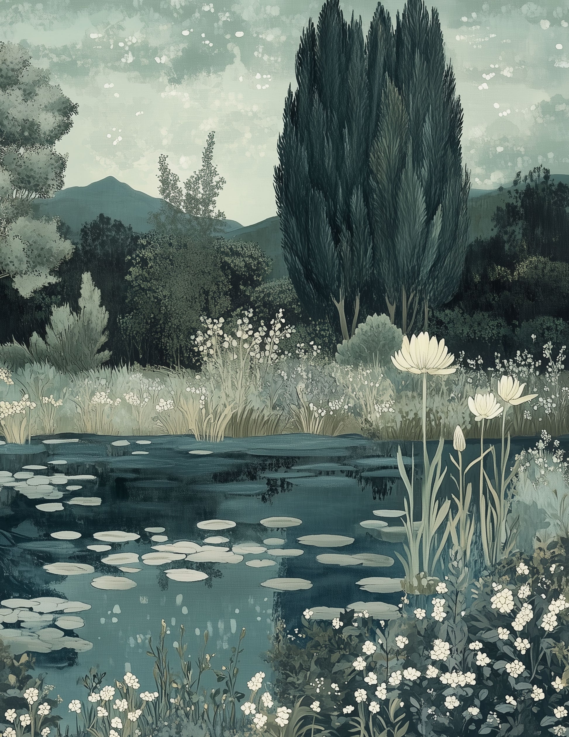 Bohemian inspired landscape with Cypress trees, in tones of blues and greens.