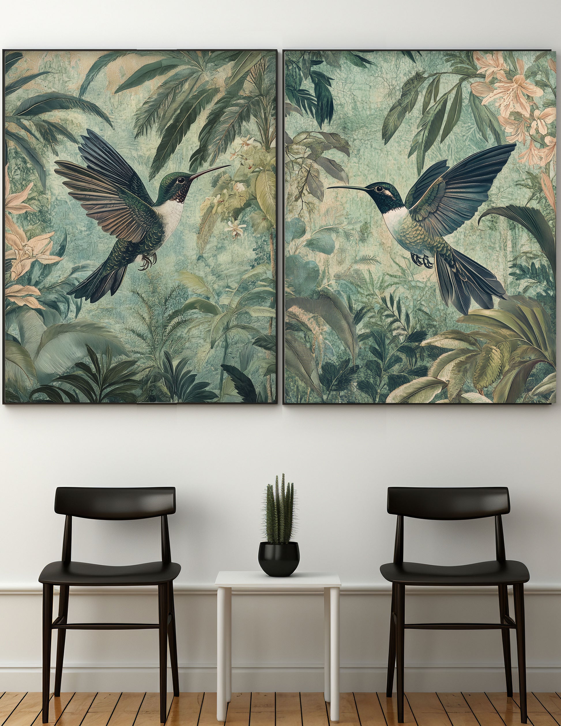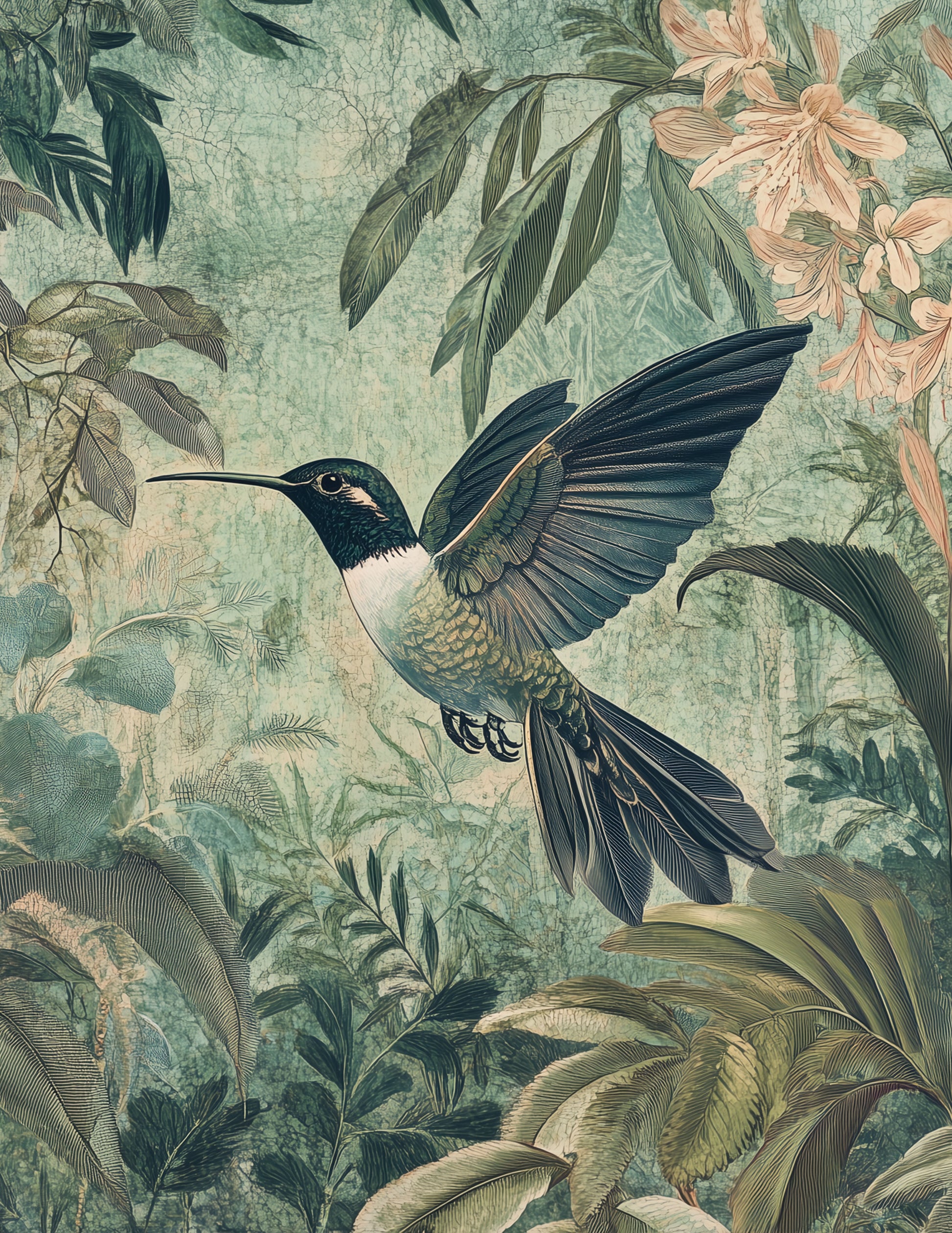 Boho inspired art piece of a Hummingbird, in tones of blues and greens.