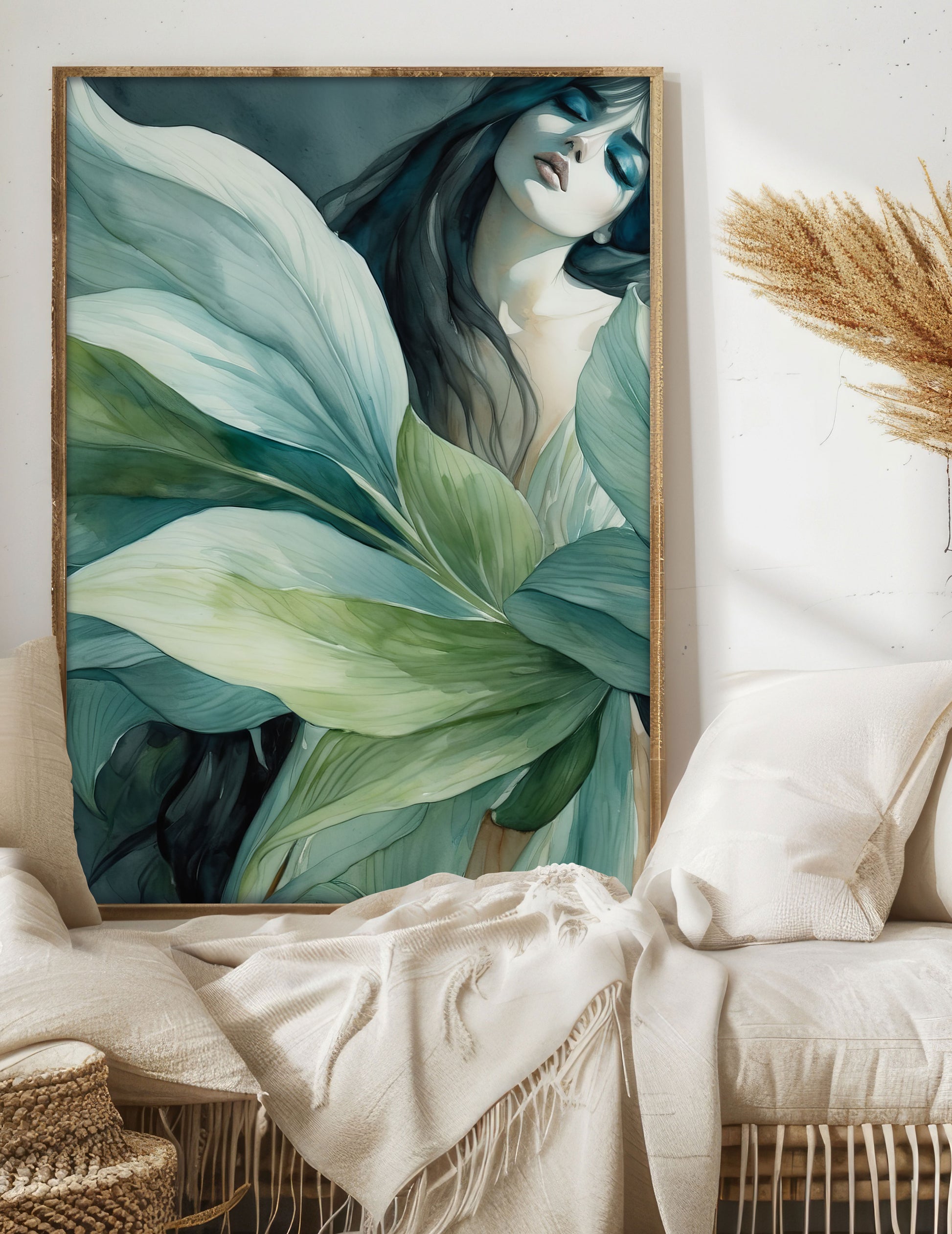 Sof Bohemian art piece of beautiful woman surrounded in soft florals in tones in blues & greens.