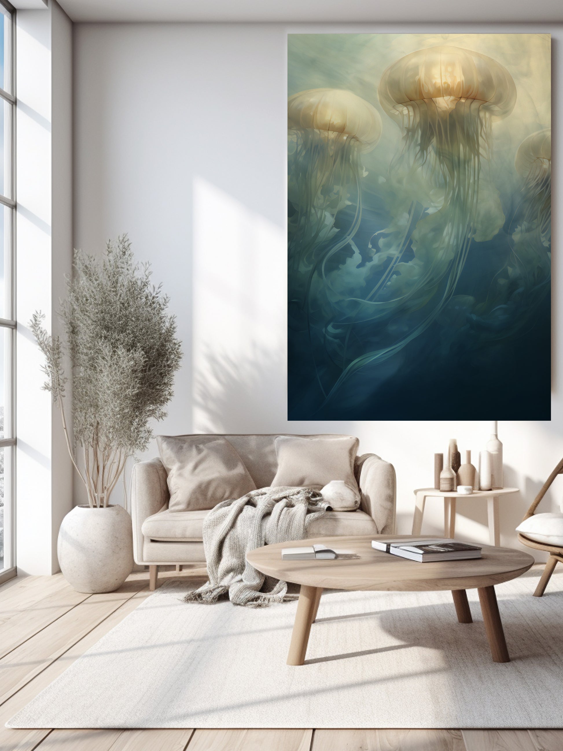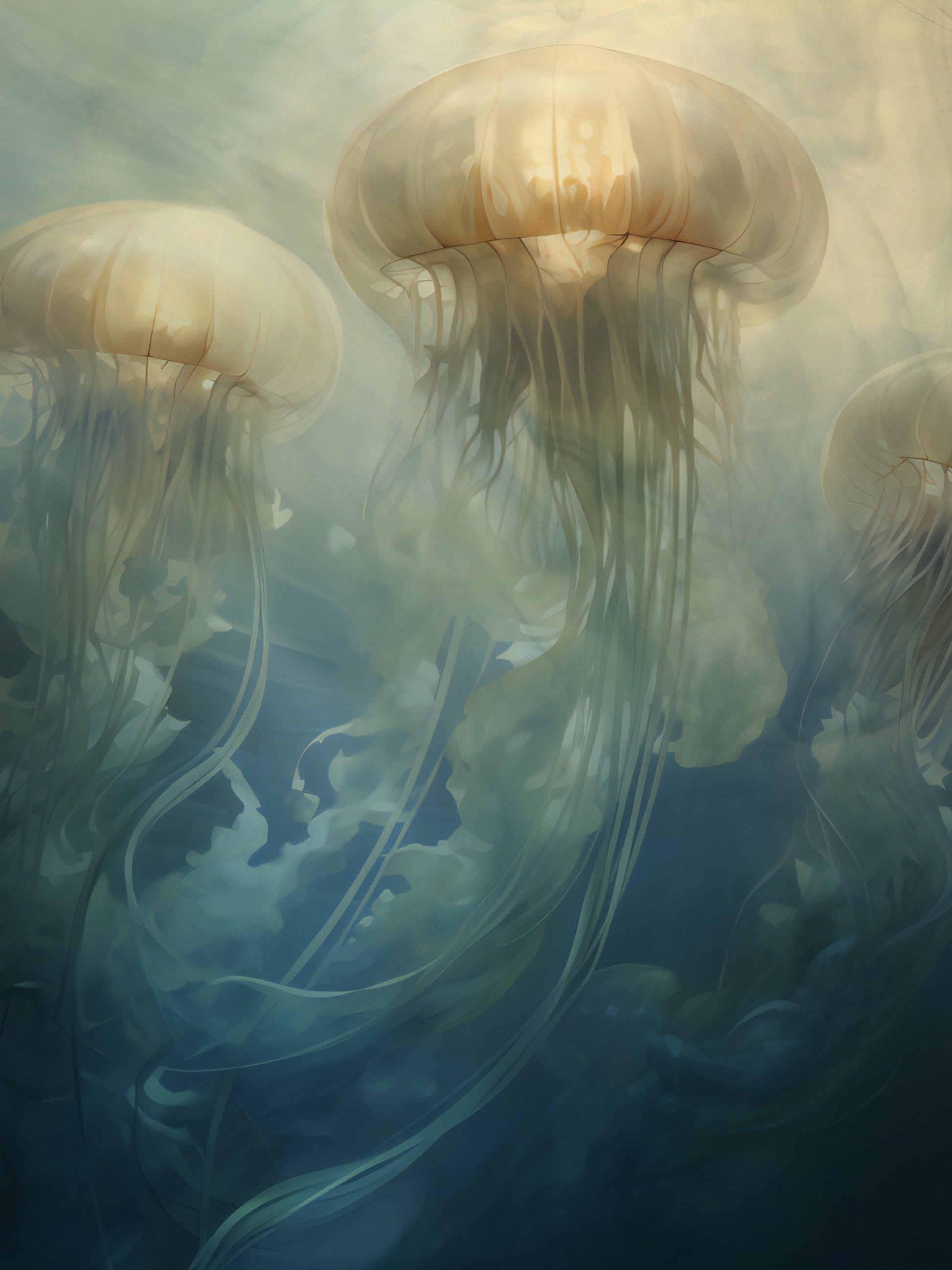 Underwater piece of flowing Jellies in yellow & blue tones.