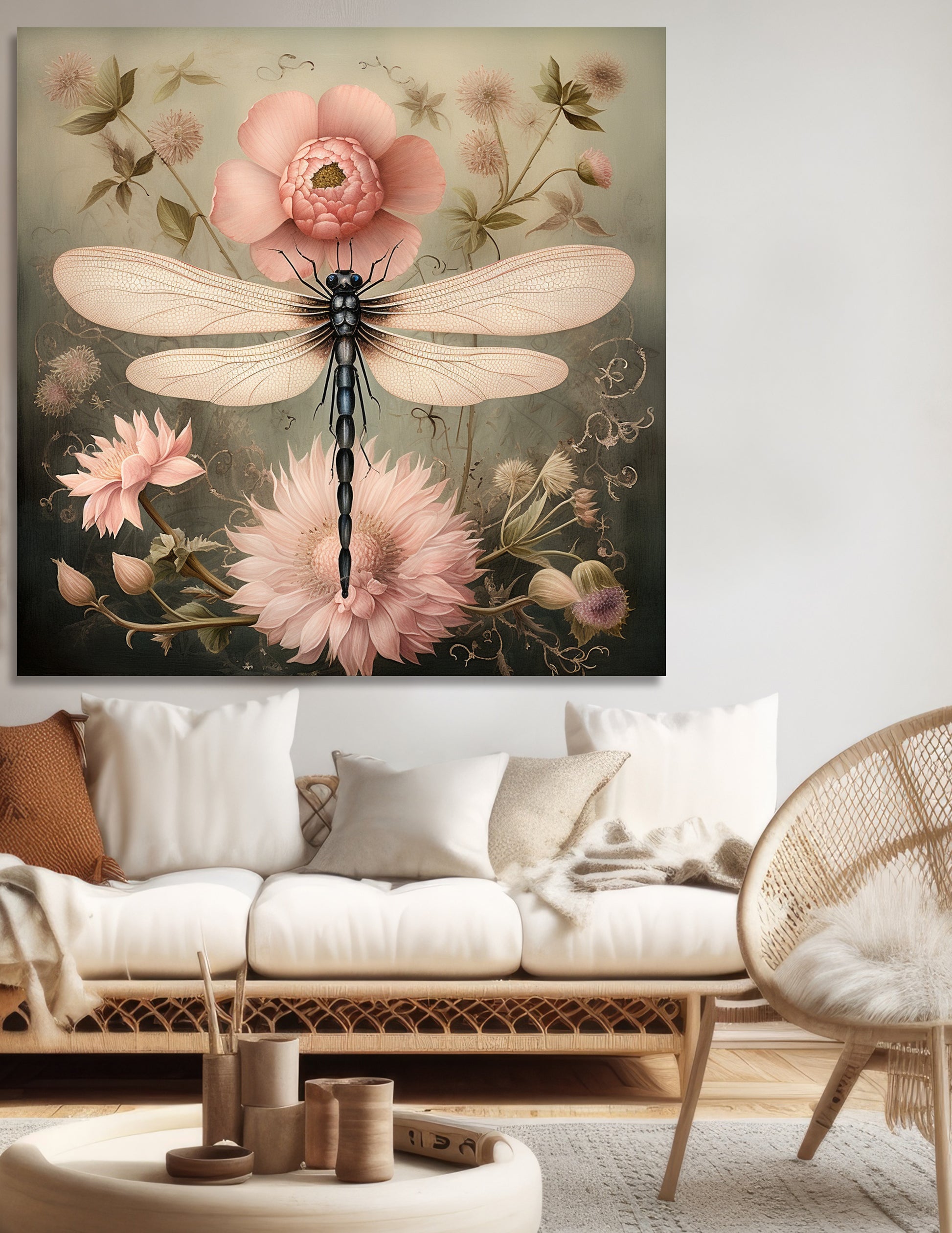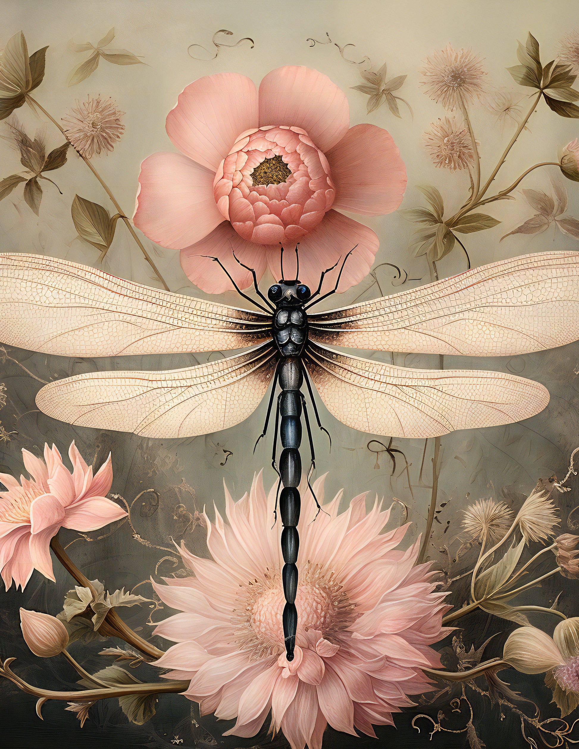 Vintage inspired whimsical Portrait of a dragonfly surrounded by soft florals.