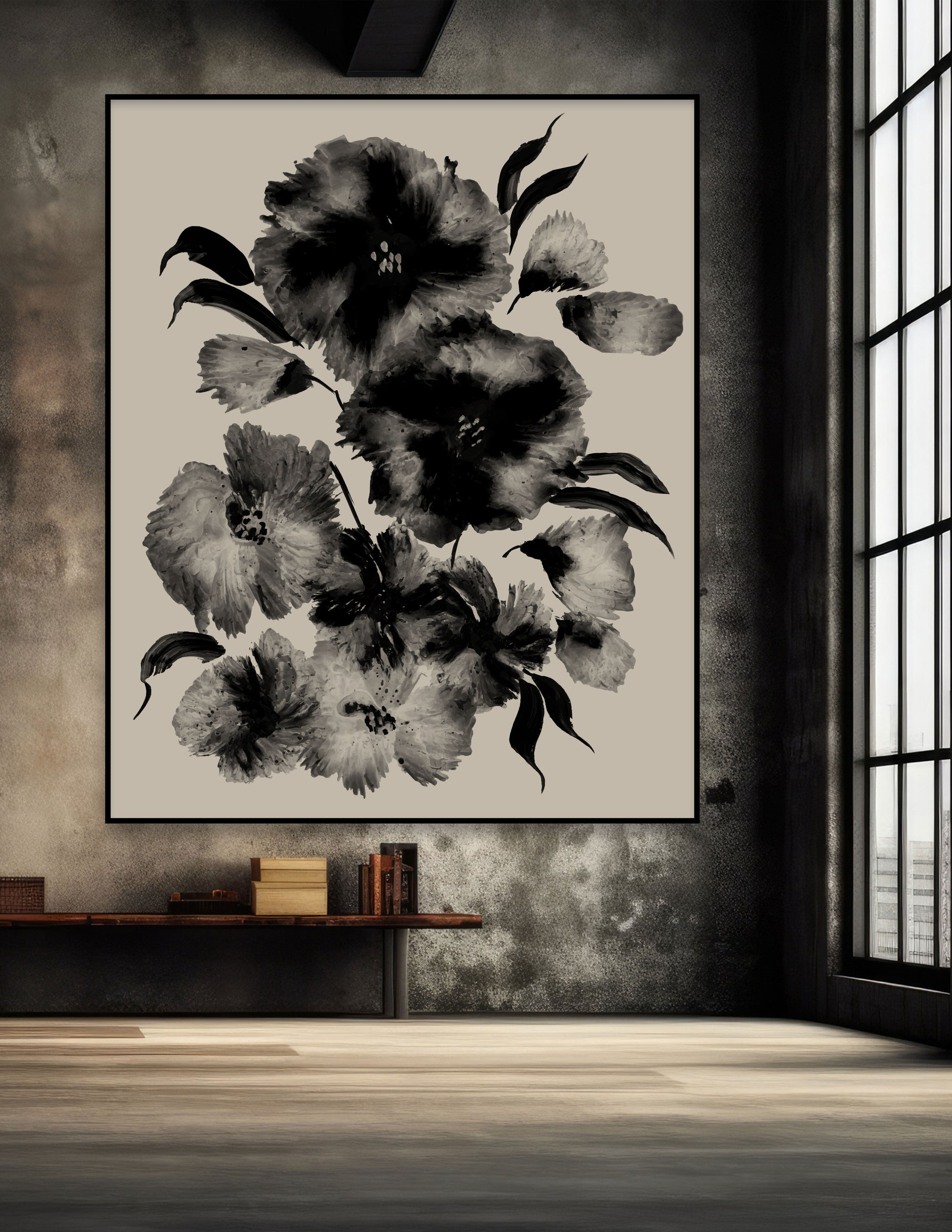 Dramatic black and white Floral art piece.