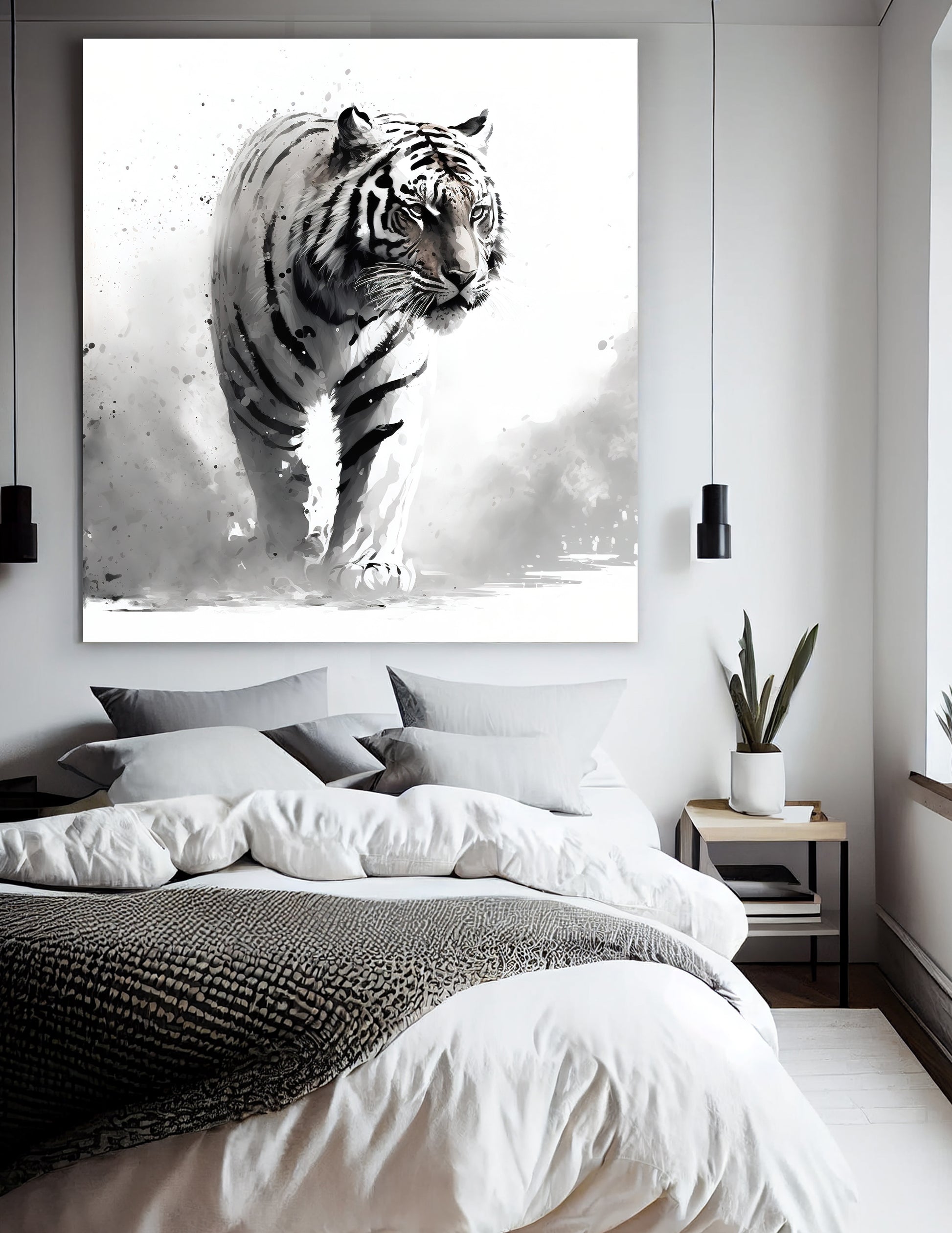 Simplistic striking monotoned art piece of a tiger on stark white background. Available in a series of sizes and finishes.