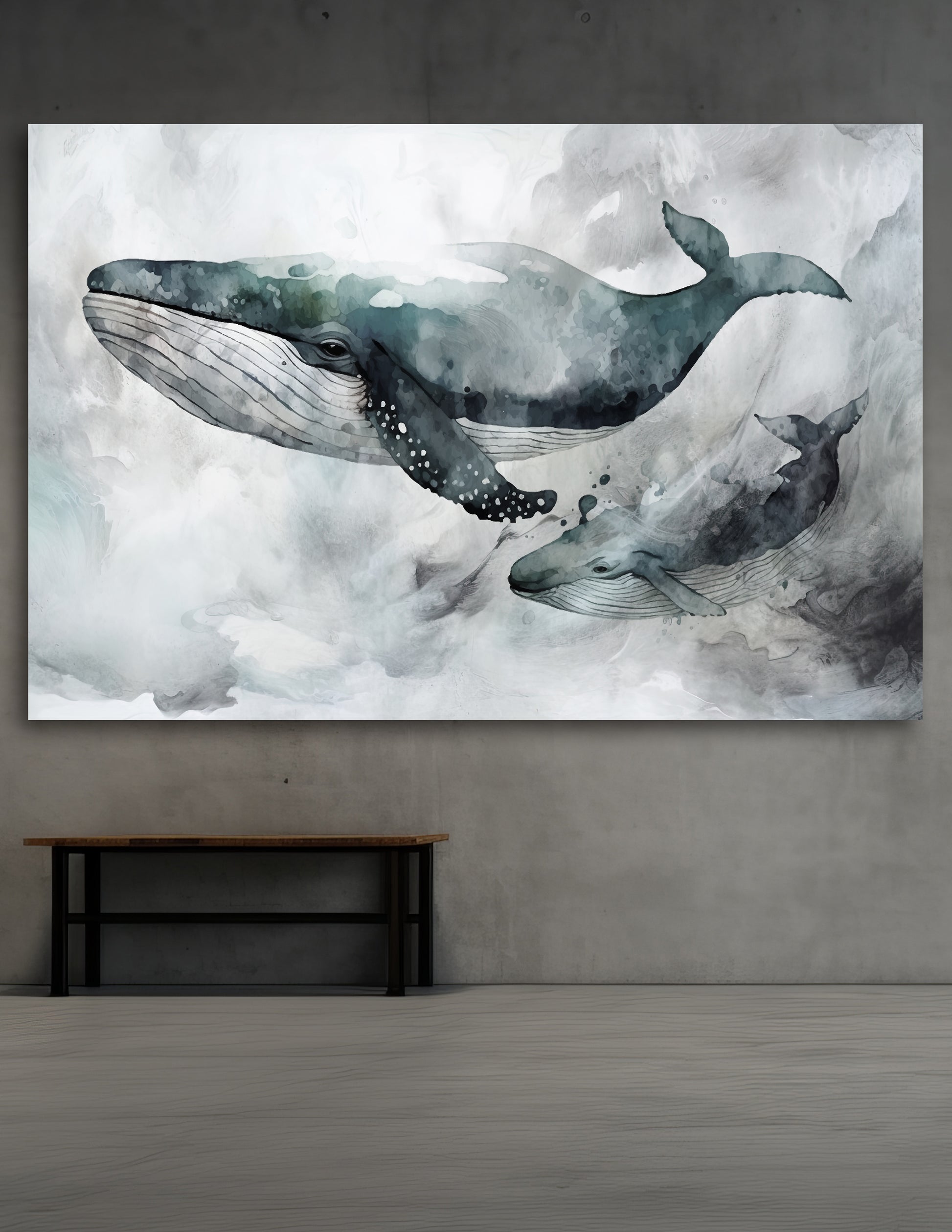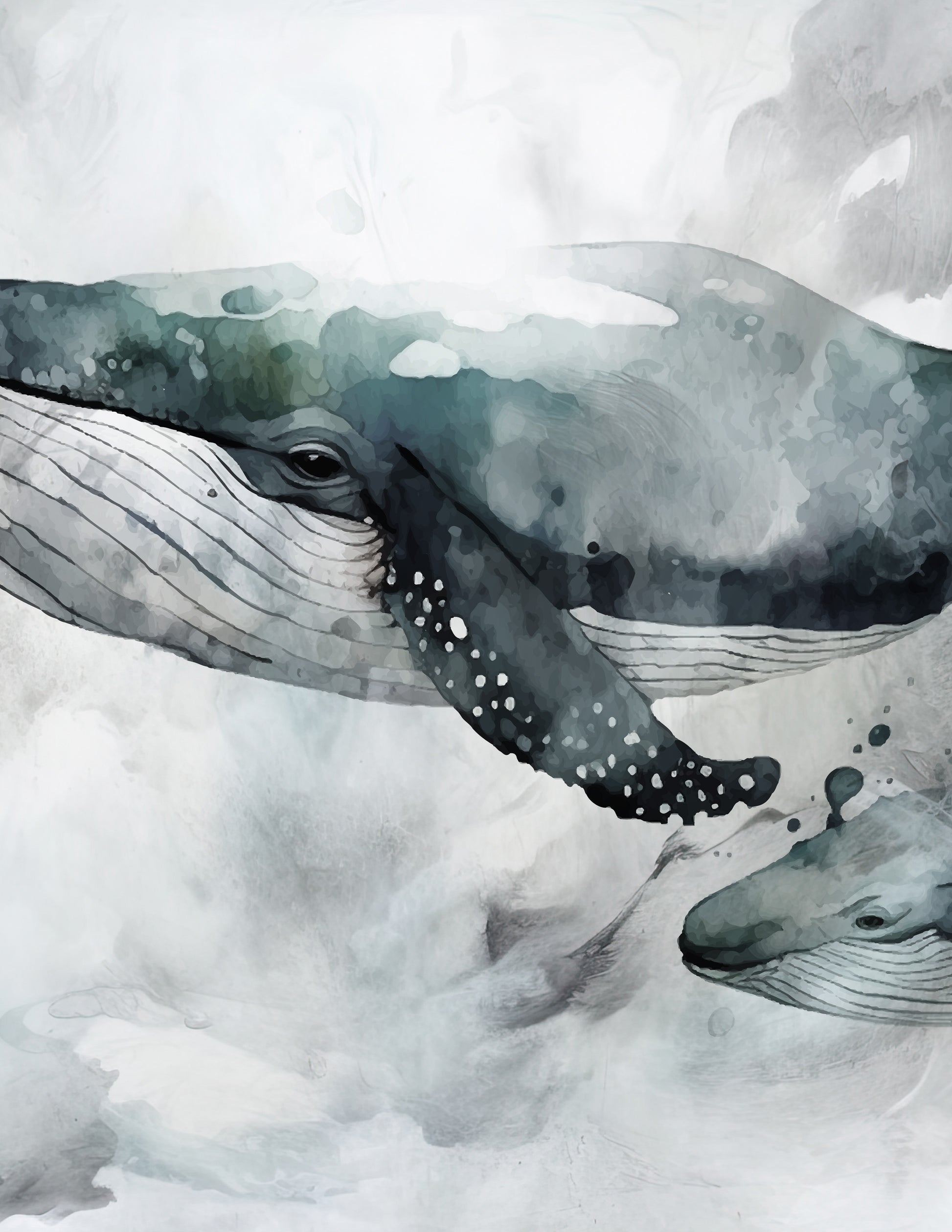 Art piece of flowing ocean with abstract whales in tones of greys.