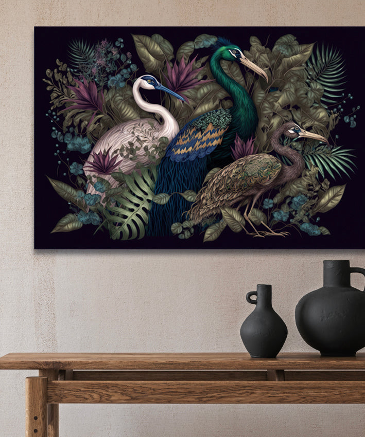 Bold vintage print of peacocks in a tropical scene.