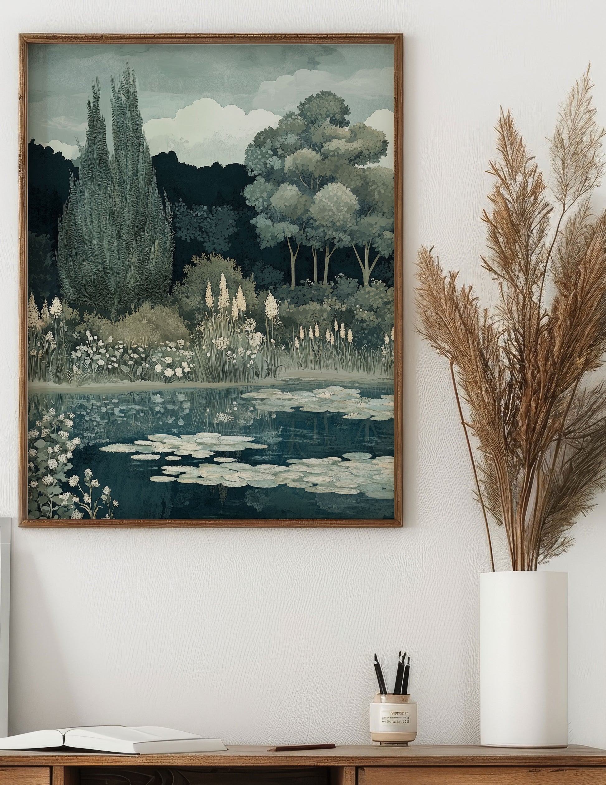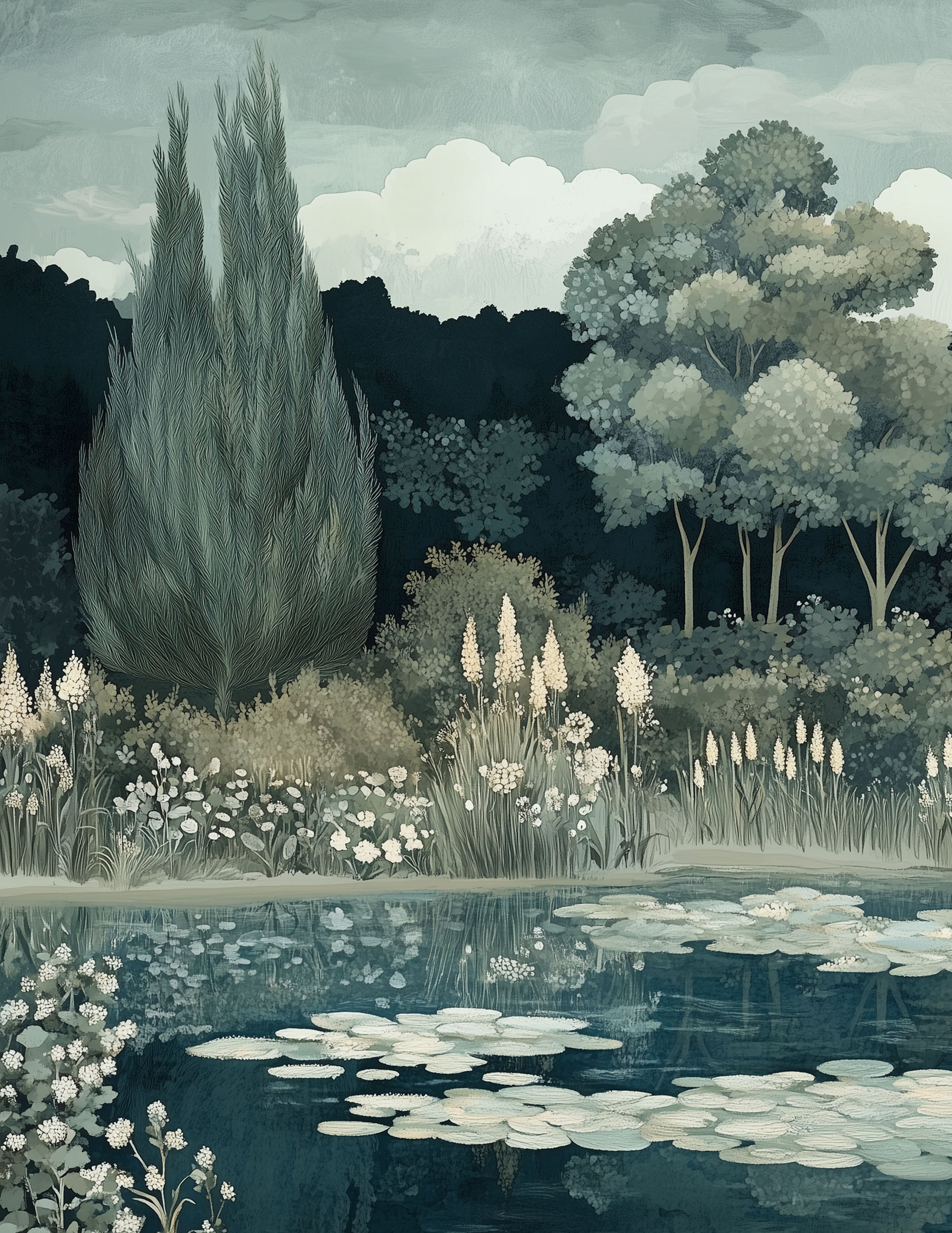 Bohemian inspired landscape with Cypress trees, in tones of blues and greens.