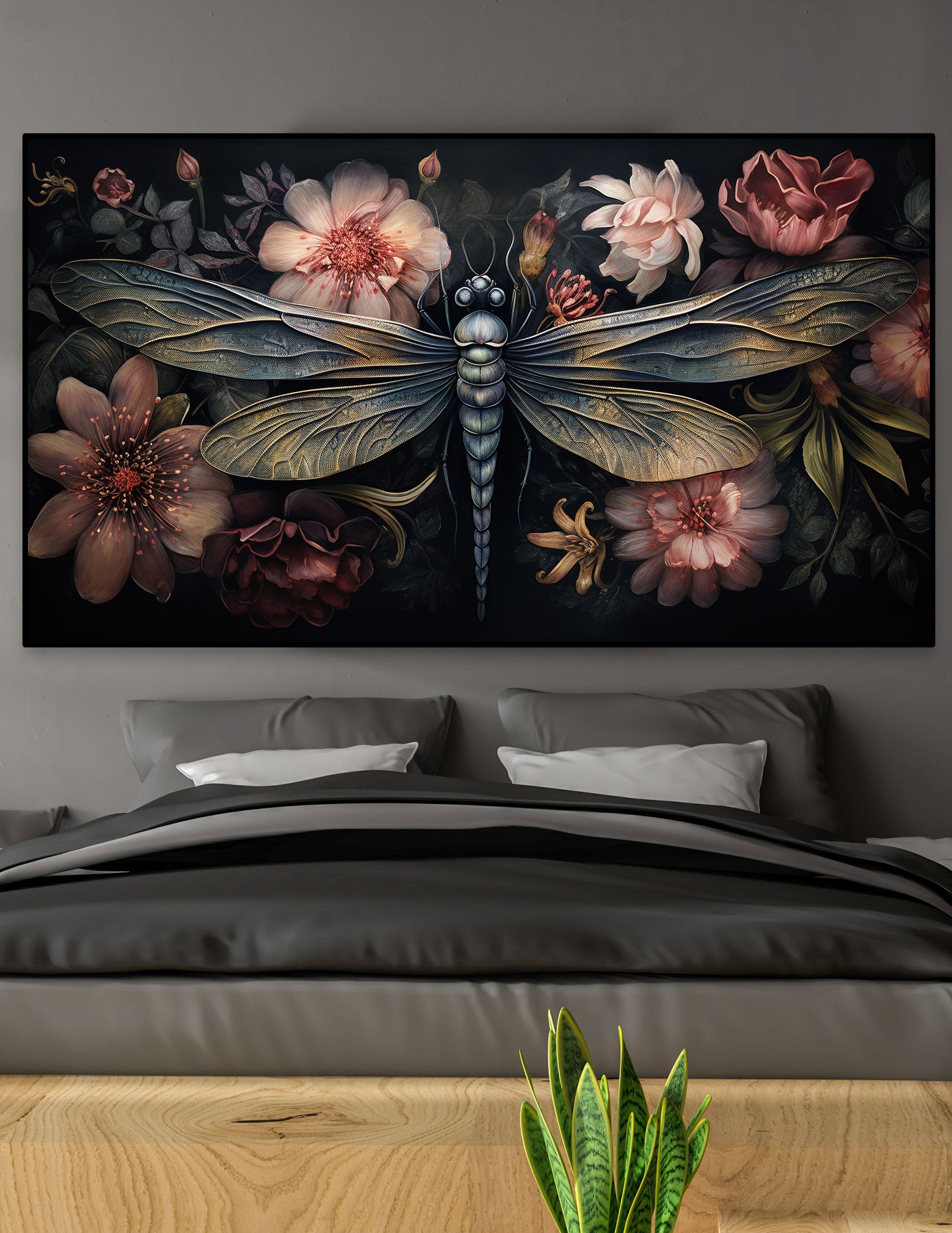 Bohemian portrait of Dragonfly with flowers.