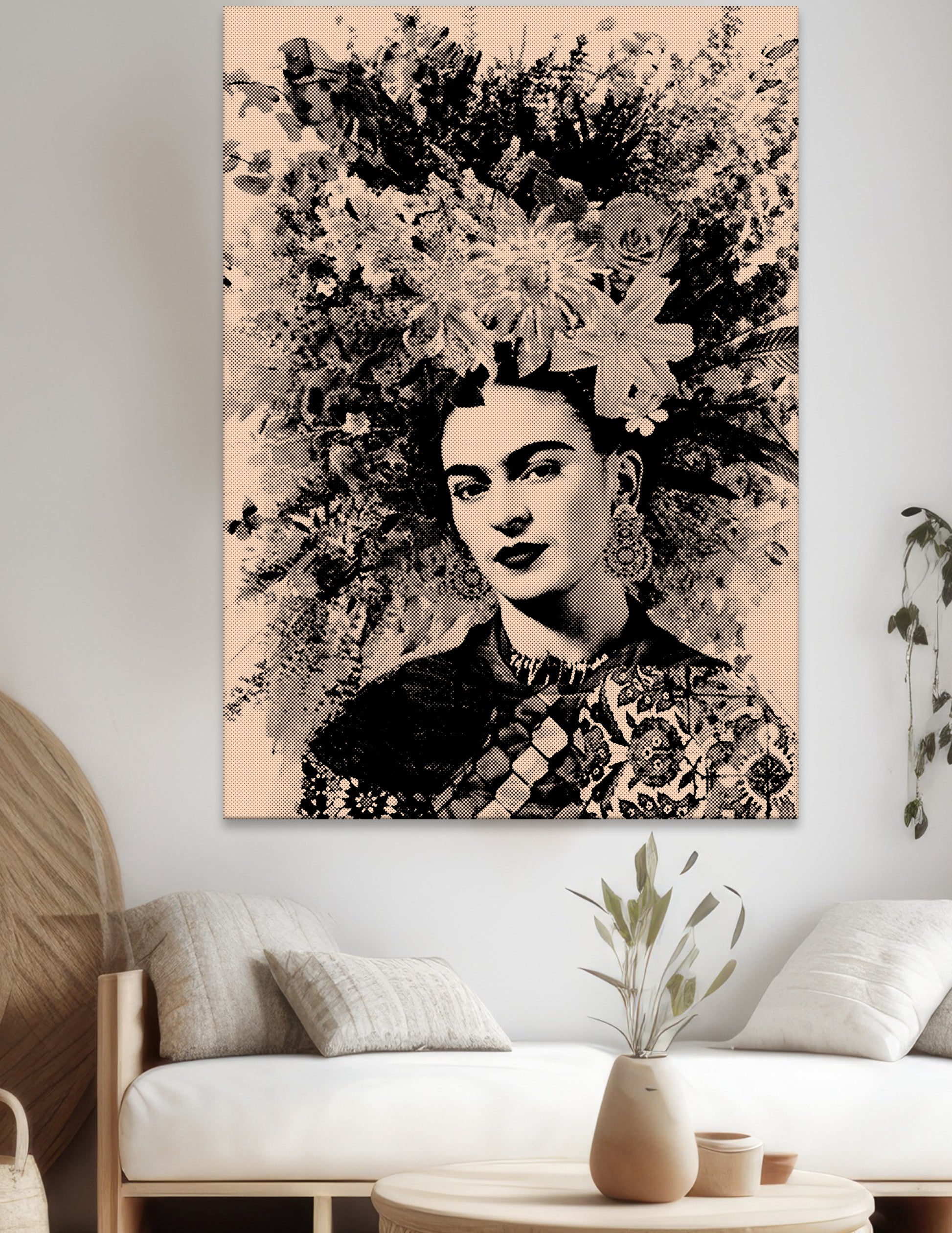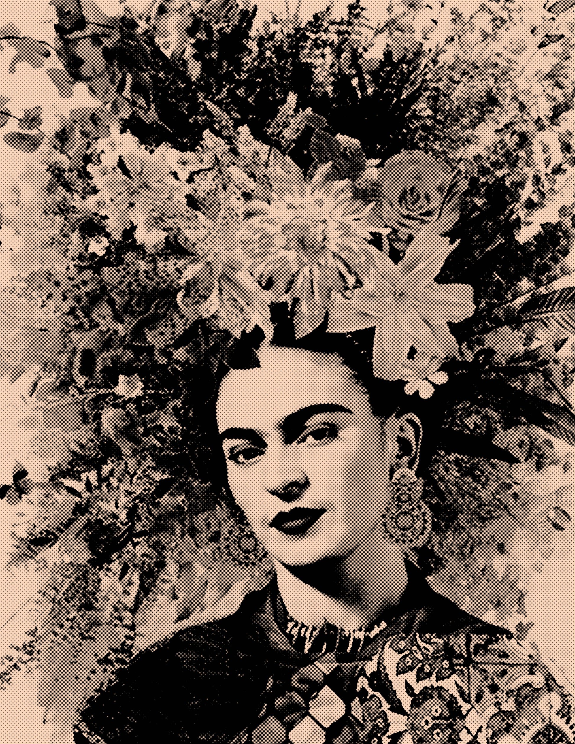 Dramatic Bohemian art piece of Frida Kahlo in tones in blues & greens.