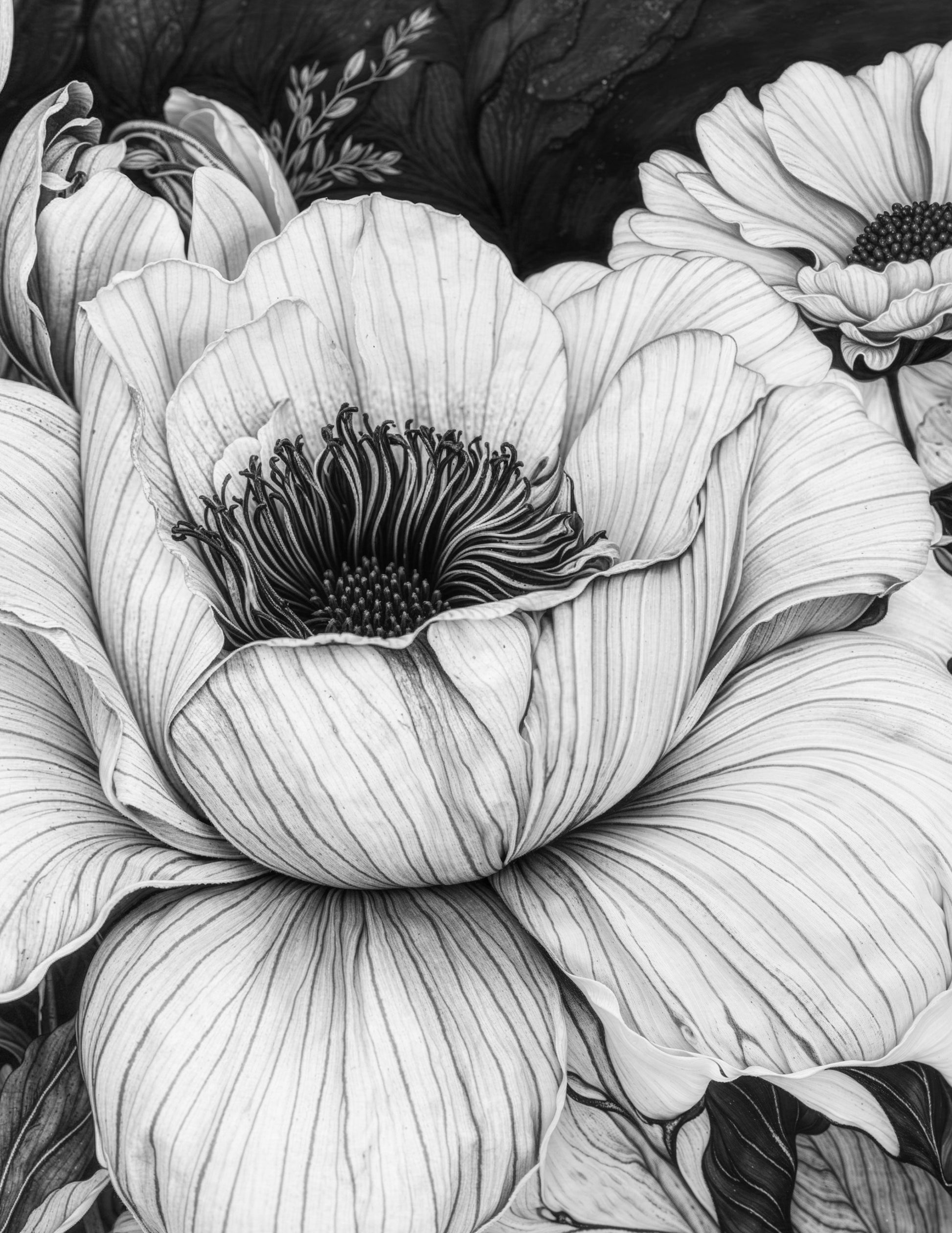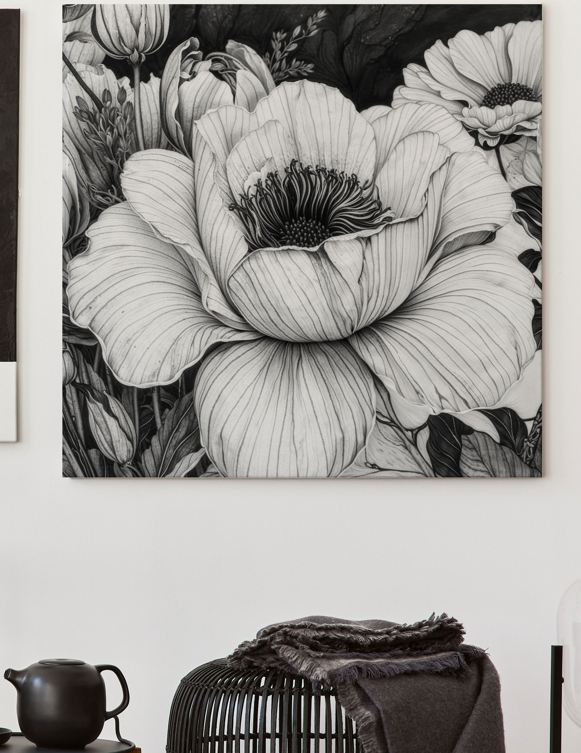 Whimsical florals in monotone. This art print is available in a series of canvas sizes, framed or unframed.