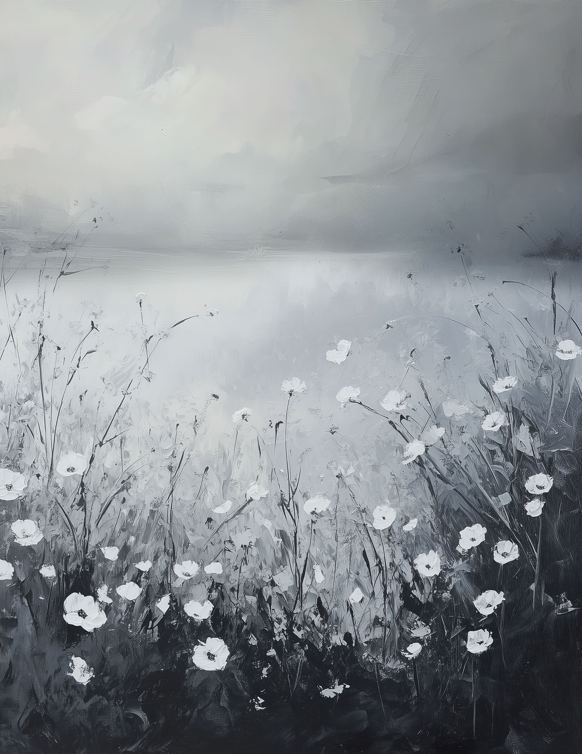 Dramatic art piece of white florals in a field of grey.