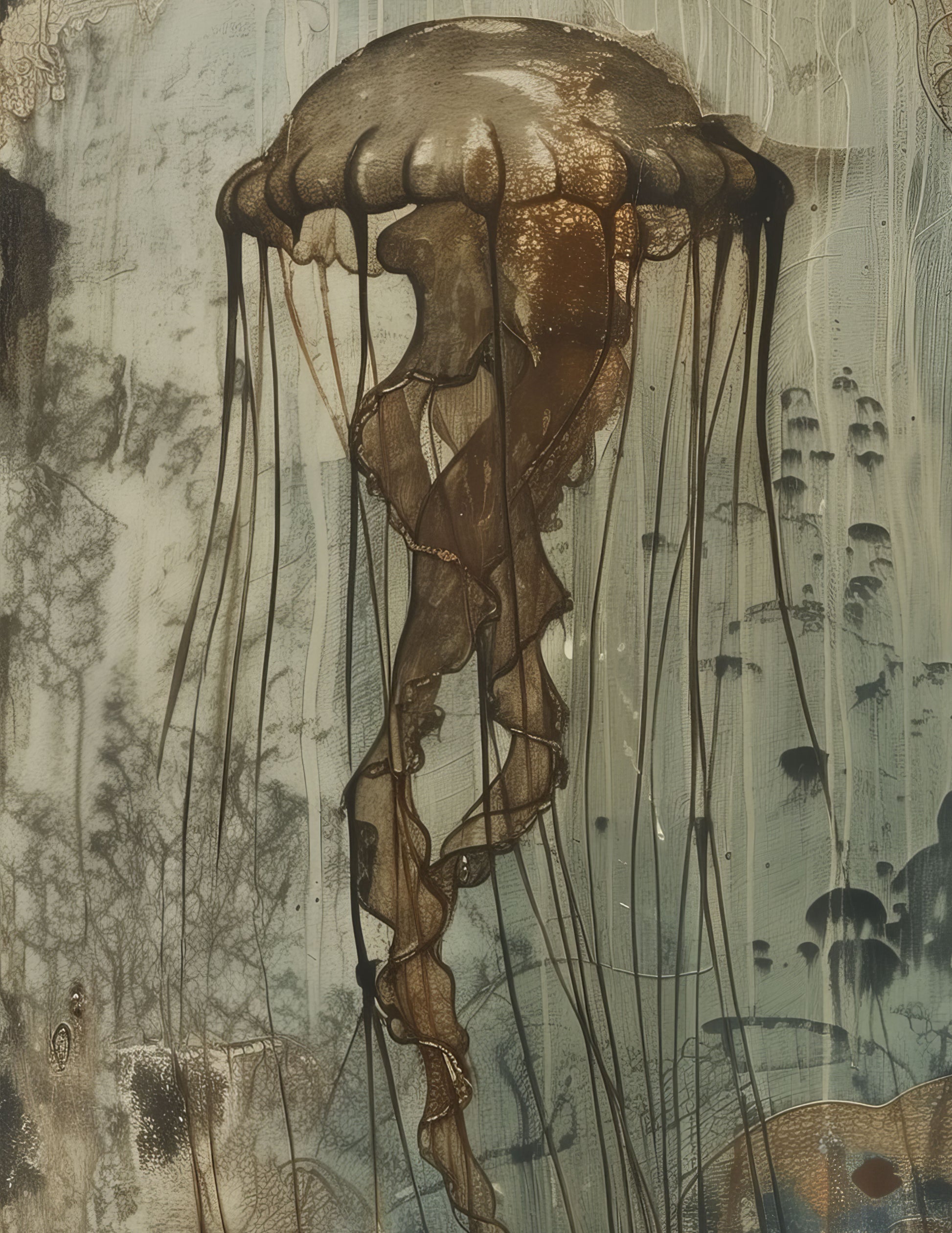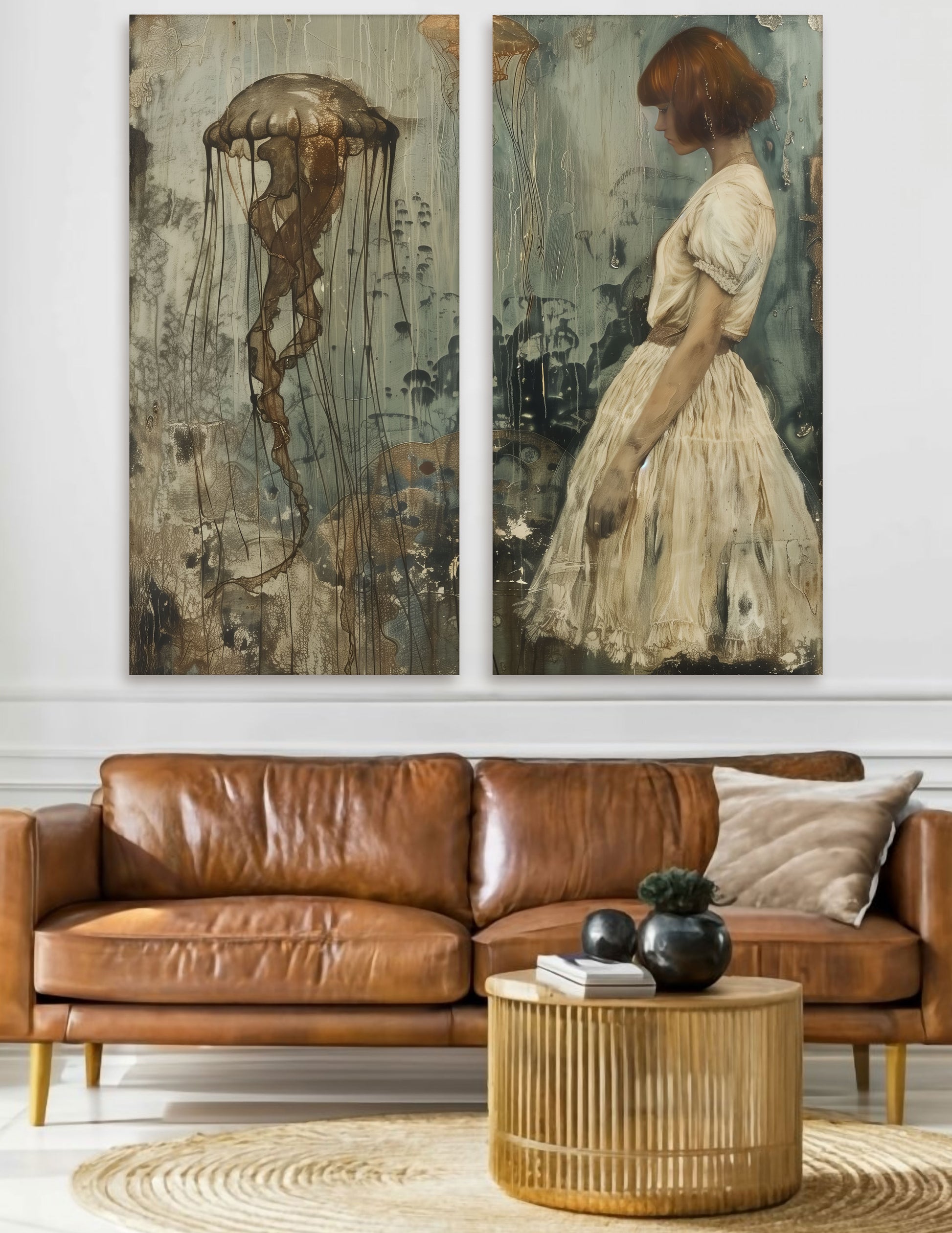 Whimsical vintage inspired art piece of a young woman in white, viewing a Jellyfish in soft neutral tones.