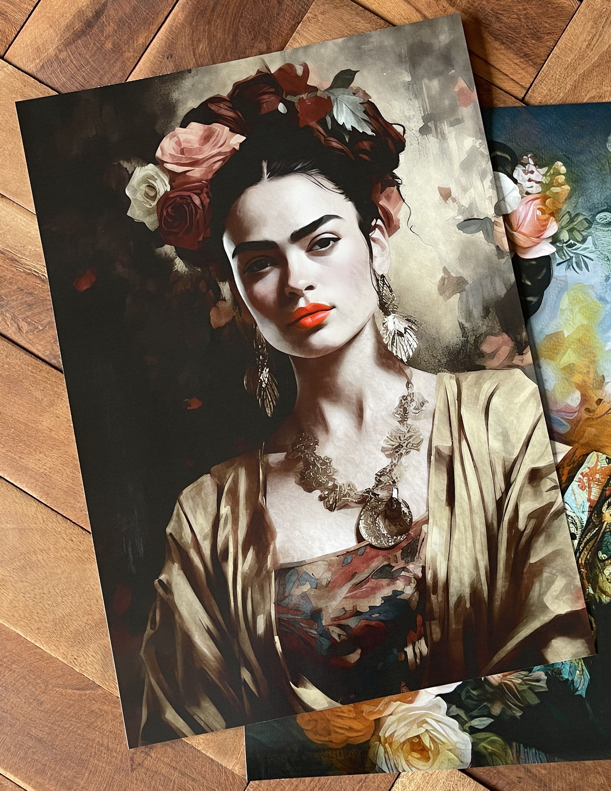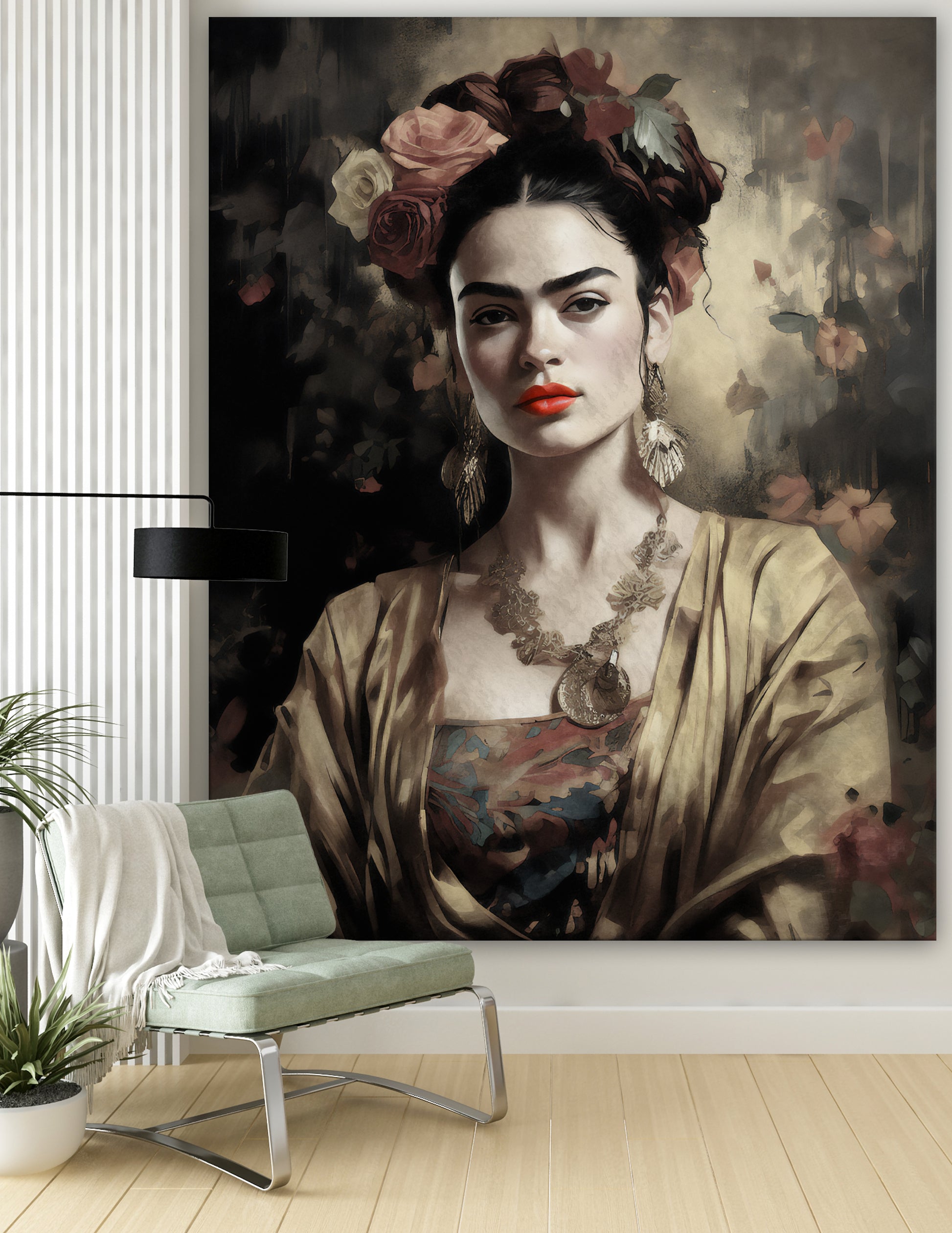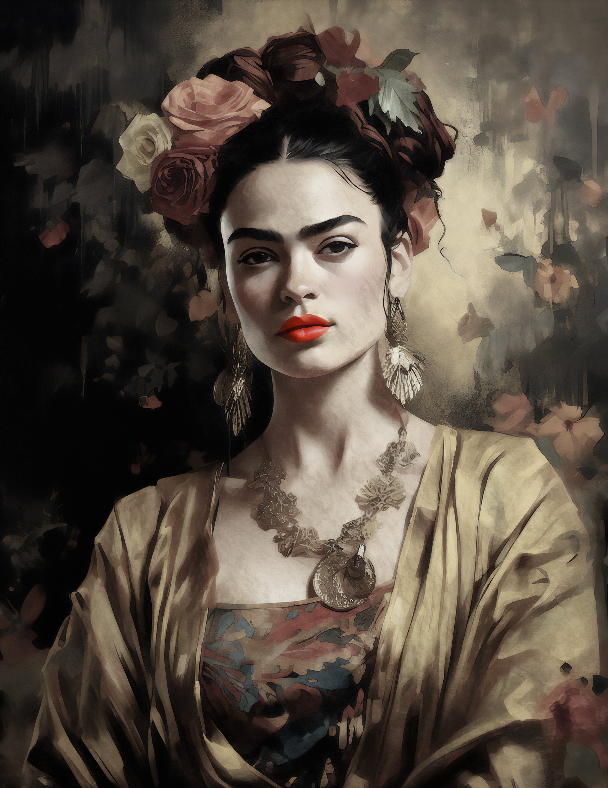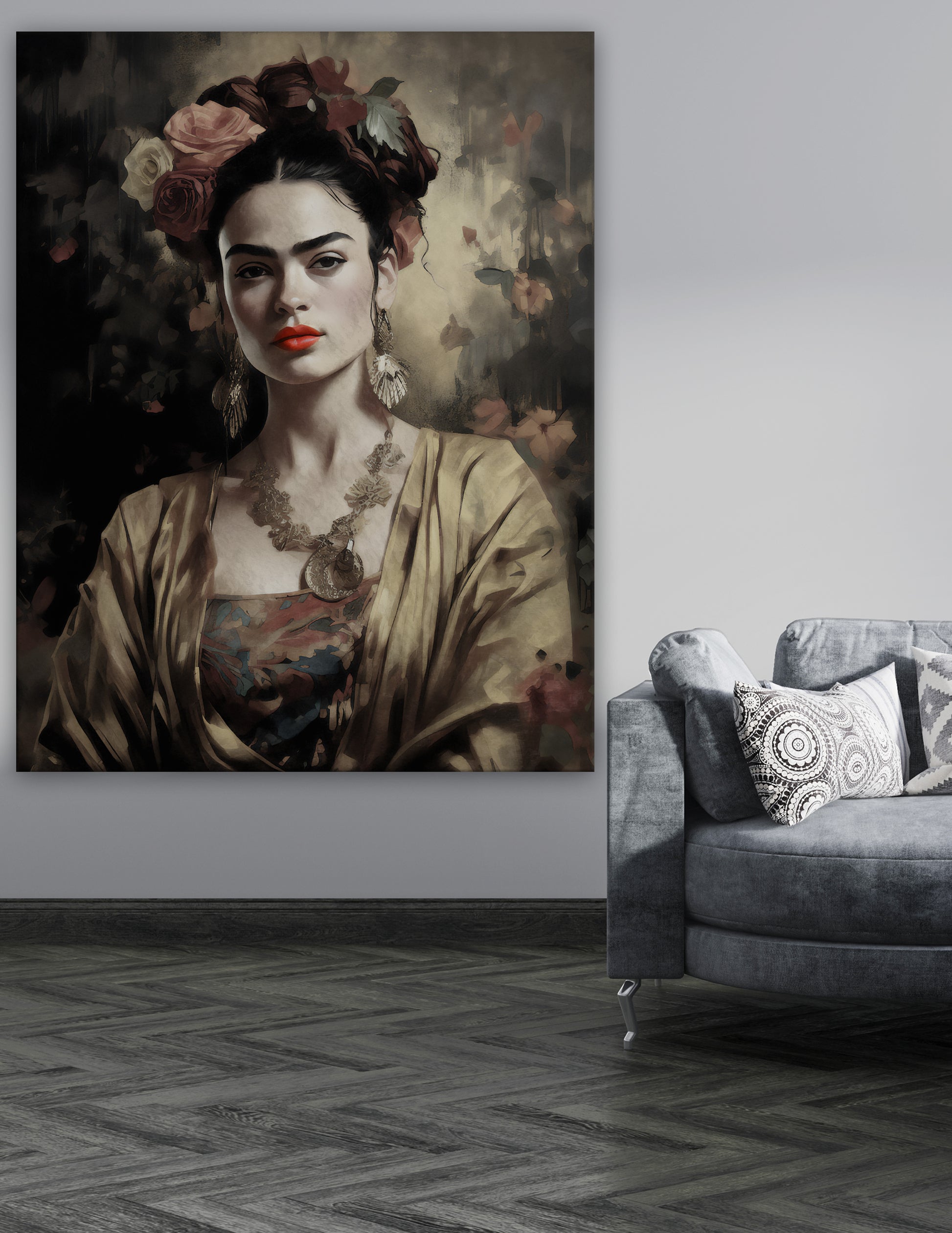 Dramatic Bohemian art piece of Frida Kahlo in pales tones and gold.