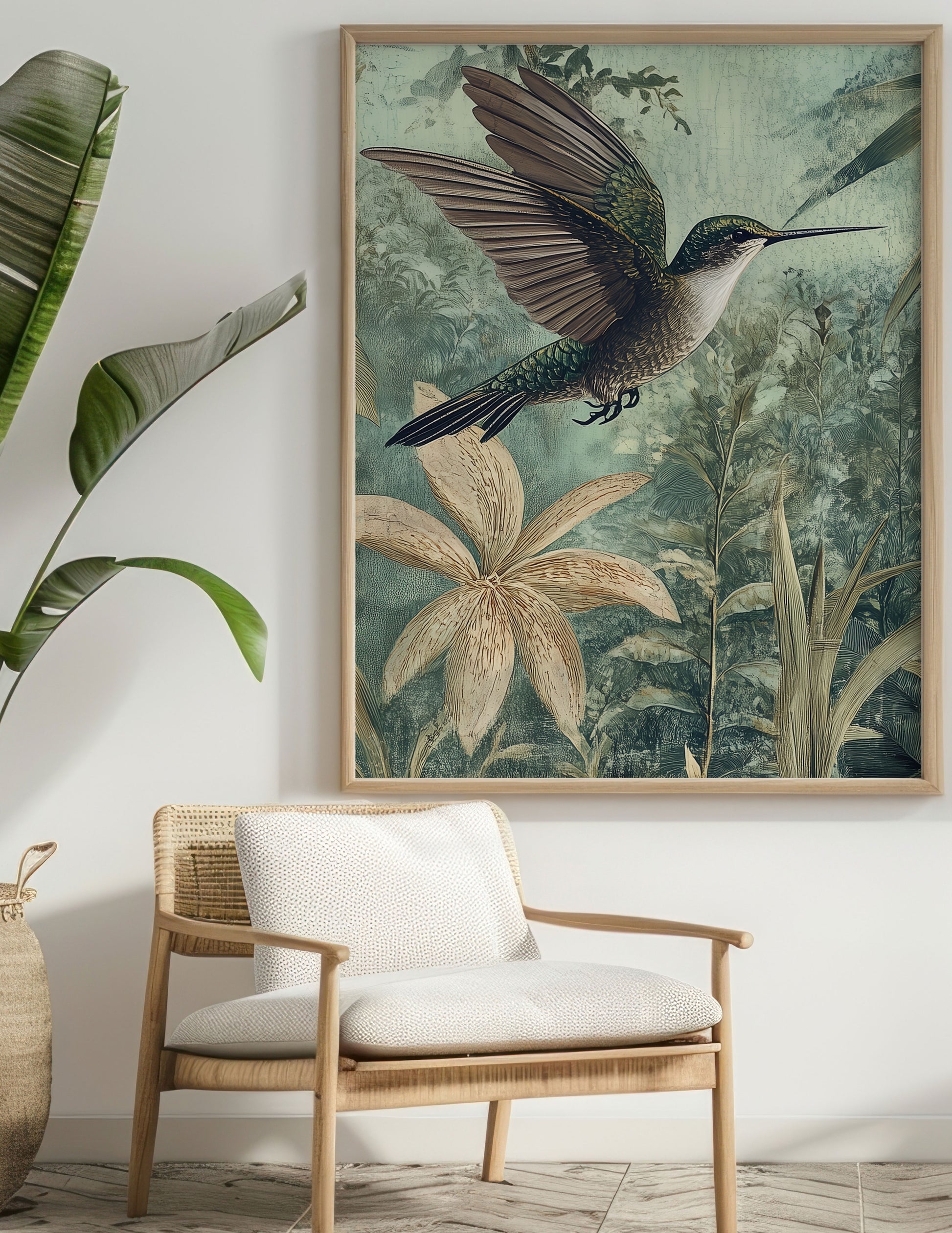 Boho inspired art piece of a Hummingbird, in tones of blues and greens.