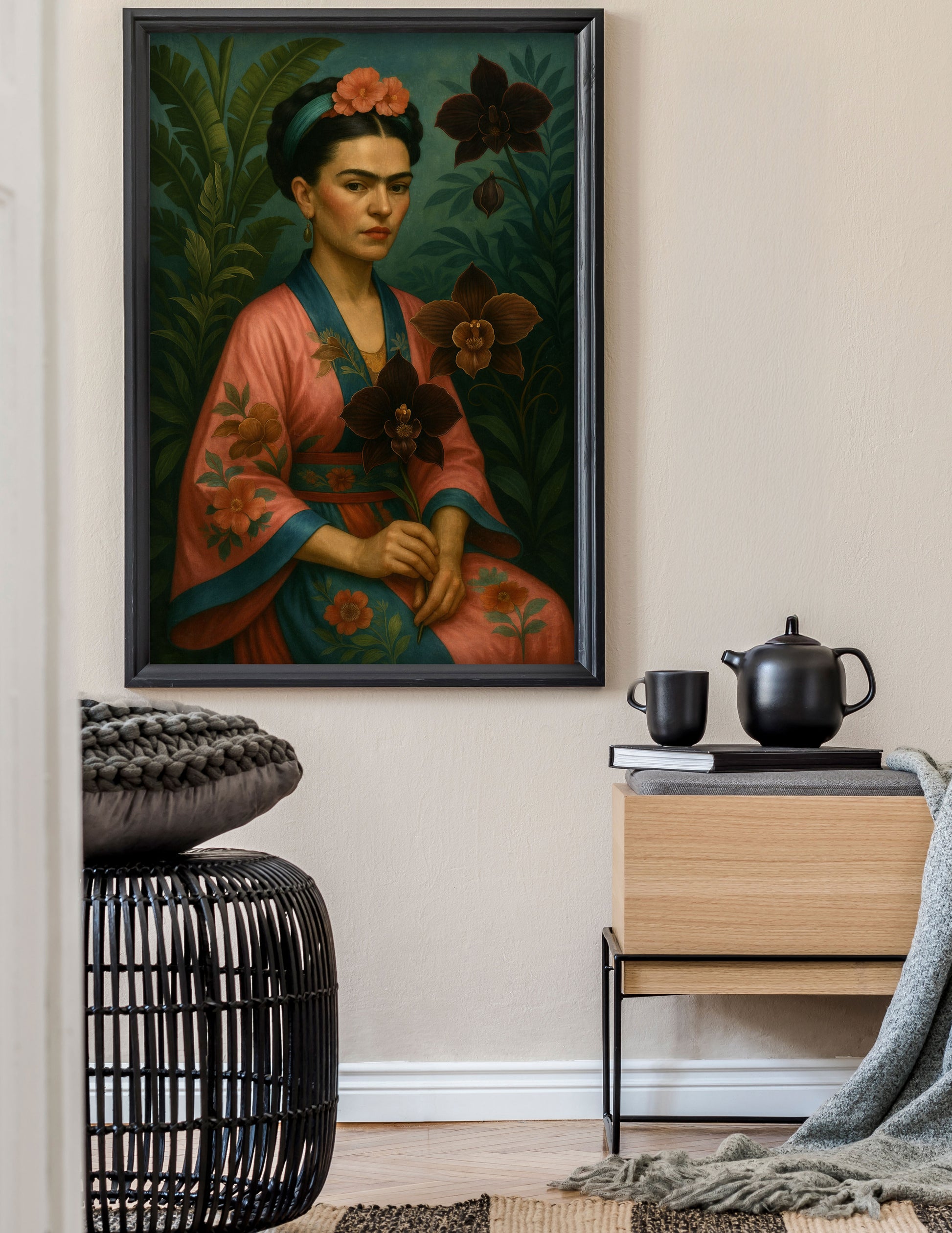 Bohemian Portrait of Frida Kahlo in a garden in vintage tones of blue and greens.