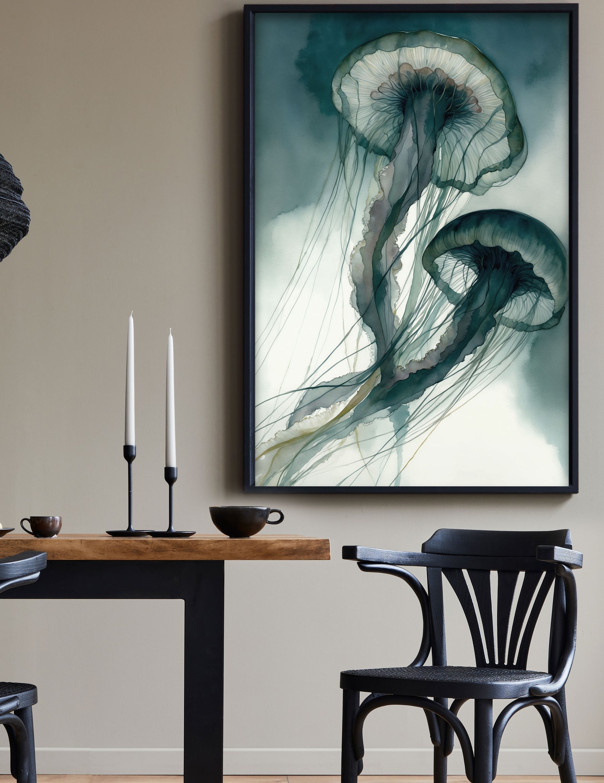 Dramatic Jellyfish in watercolours in tones of greens and blues.