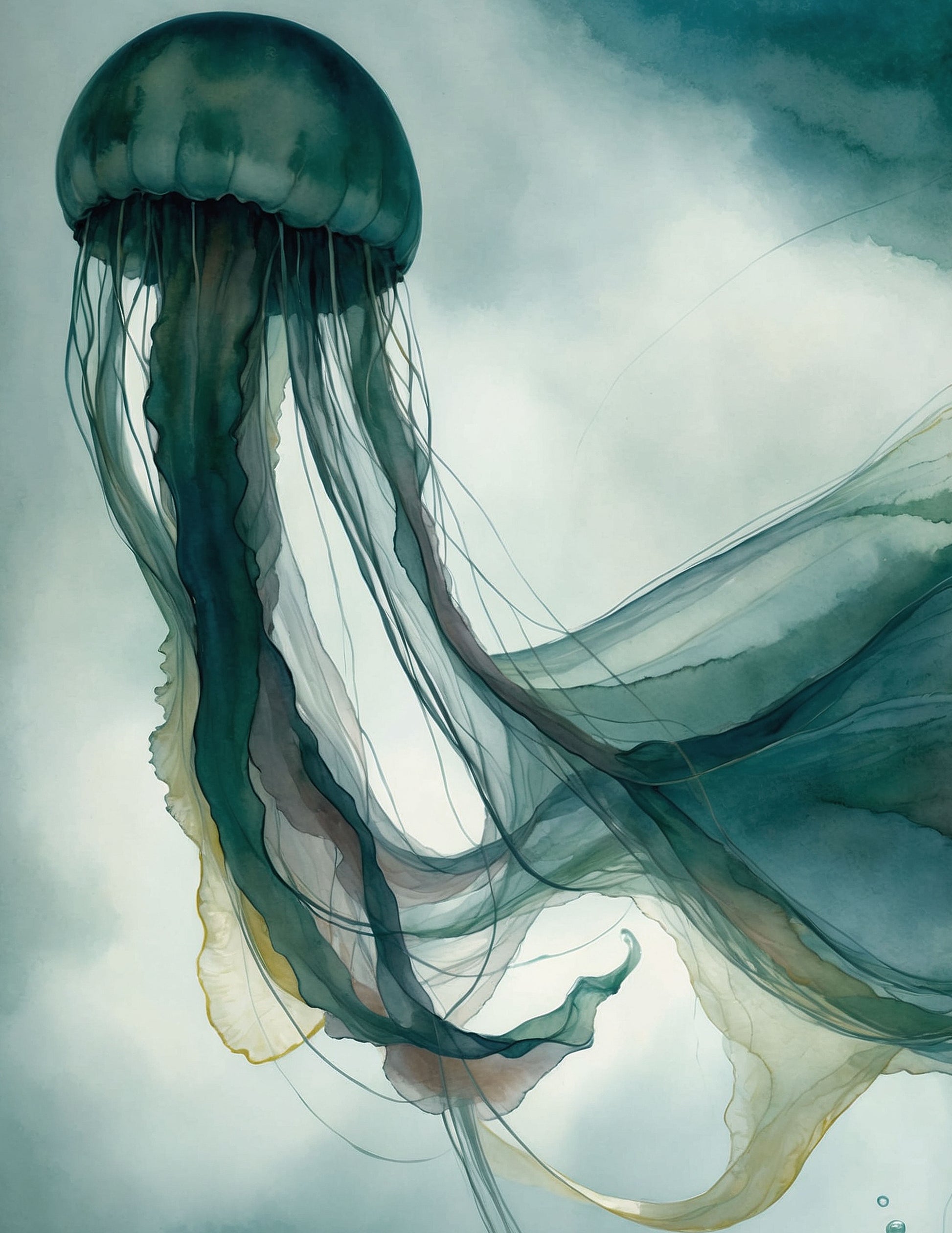 Dramatic Jellyfish in watercolours in tones of greens and blues.