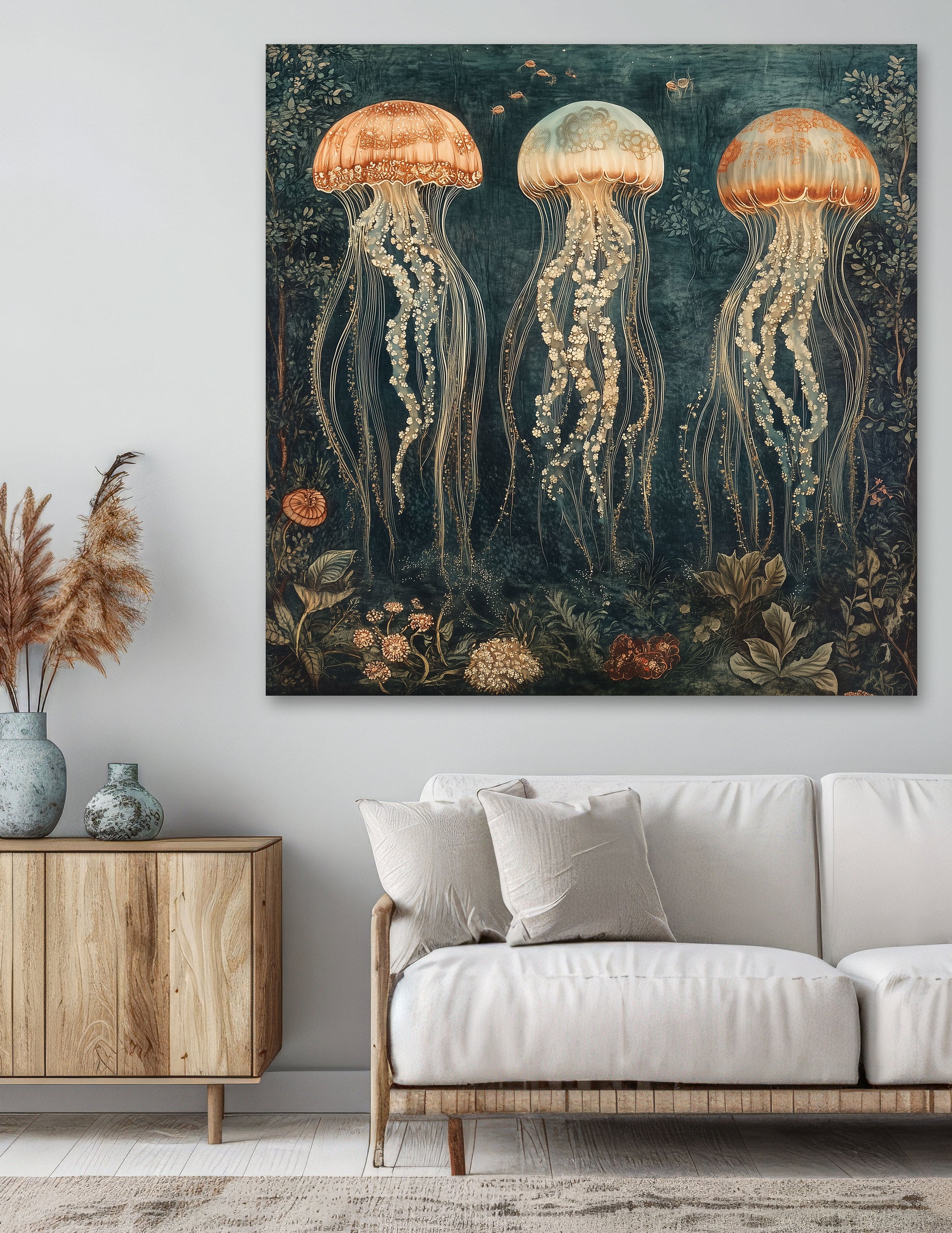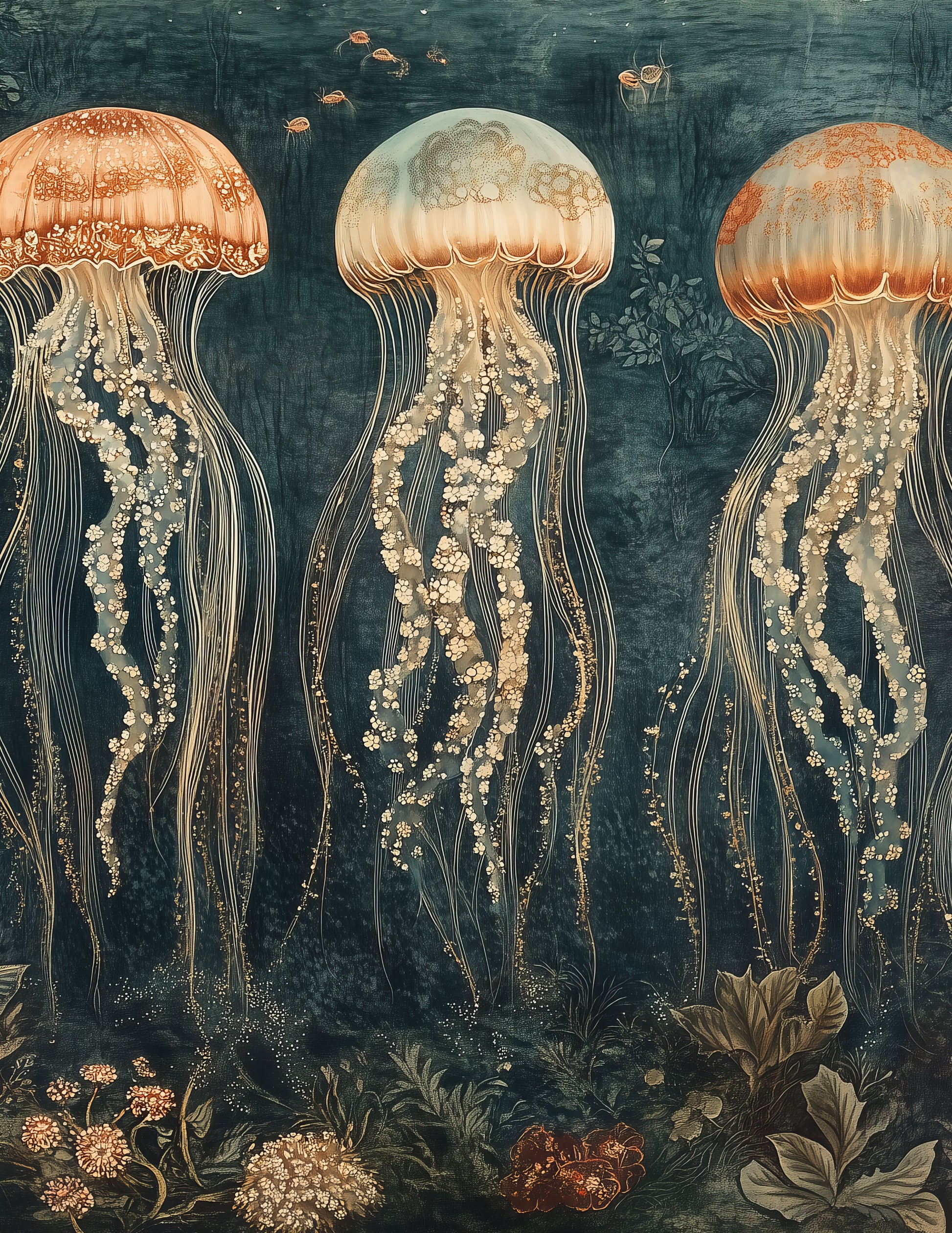 Whimsical art piece of fantasy jellyfish in the deep ocean, surrounded by florals. This piece is set in muted tones.