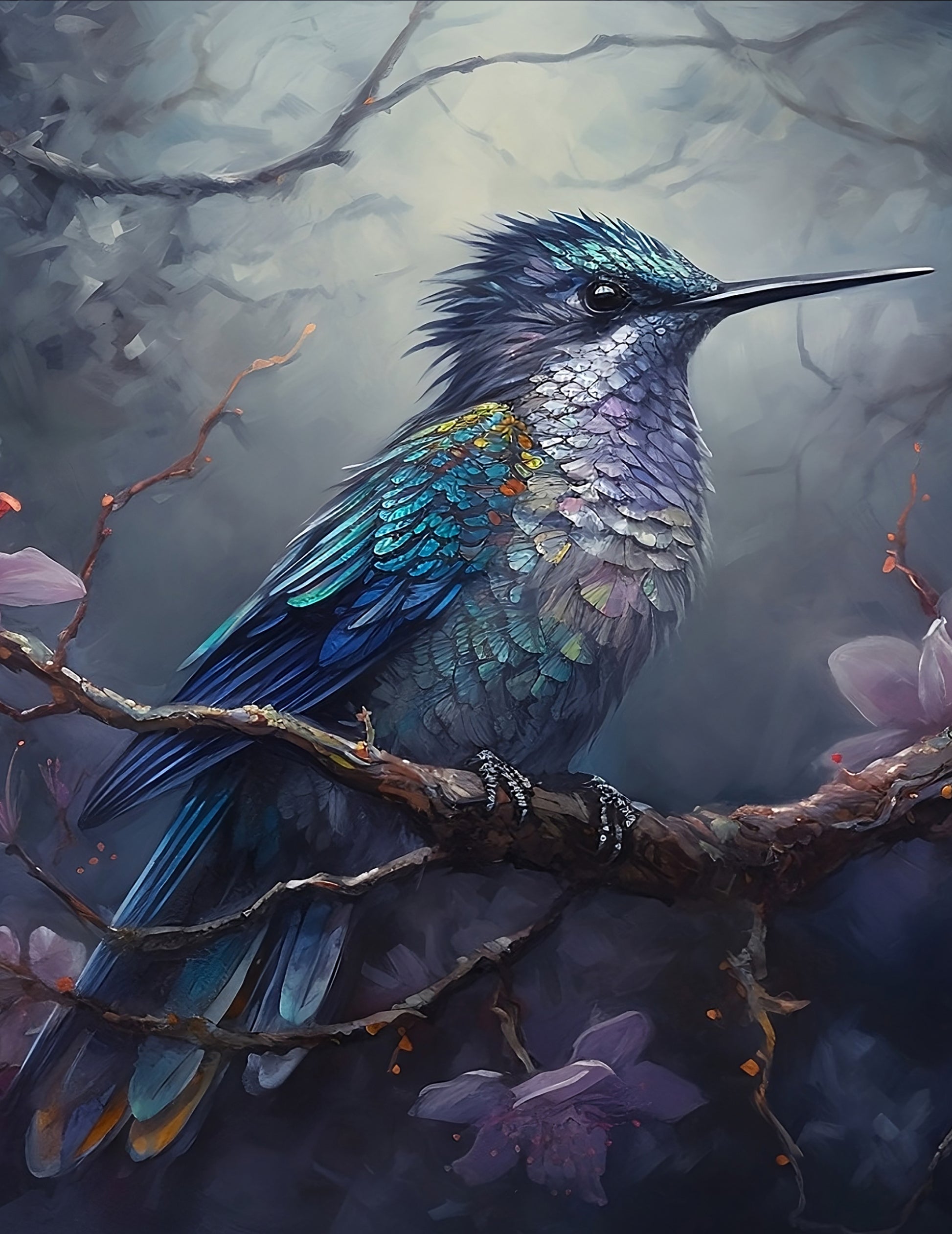 Vintage inspired art piece of Bird in tones of Blues and Purples