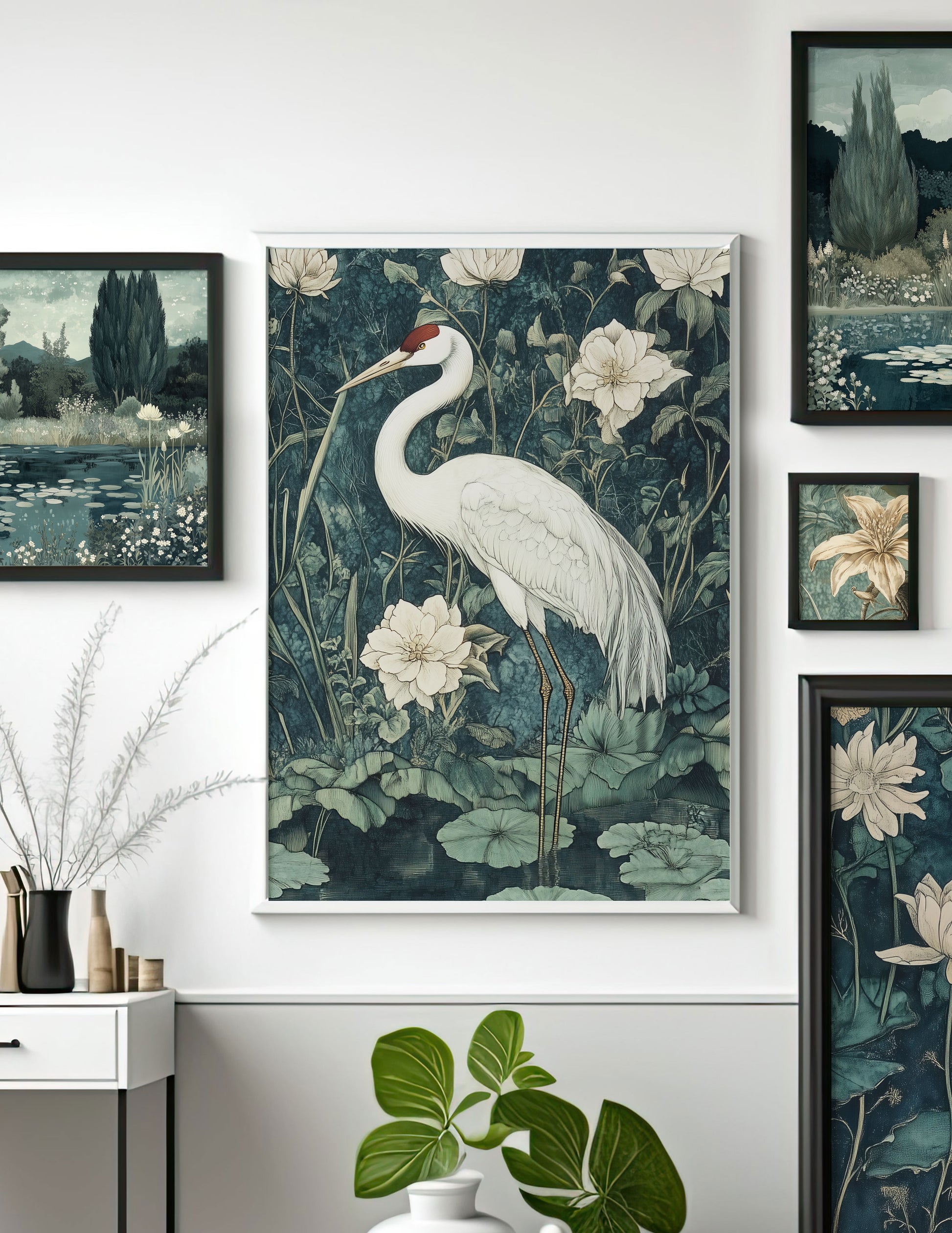 Vintage inspired art piece of white cranes standing in a lily pond, in deep tones of blues and greens.
