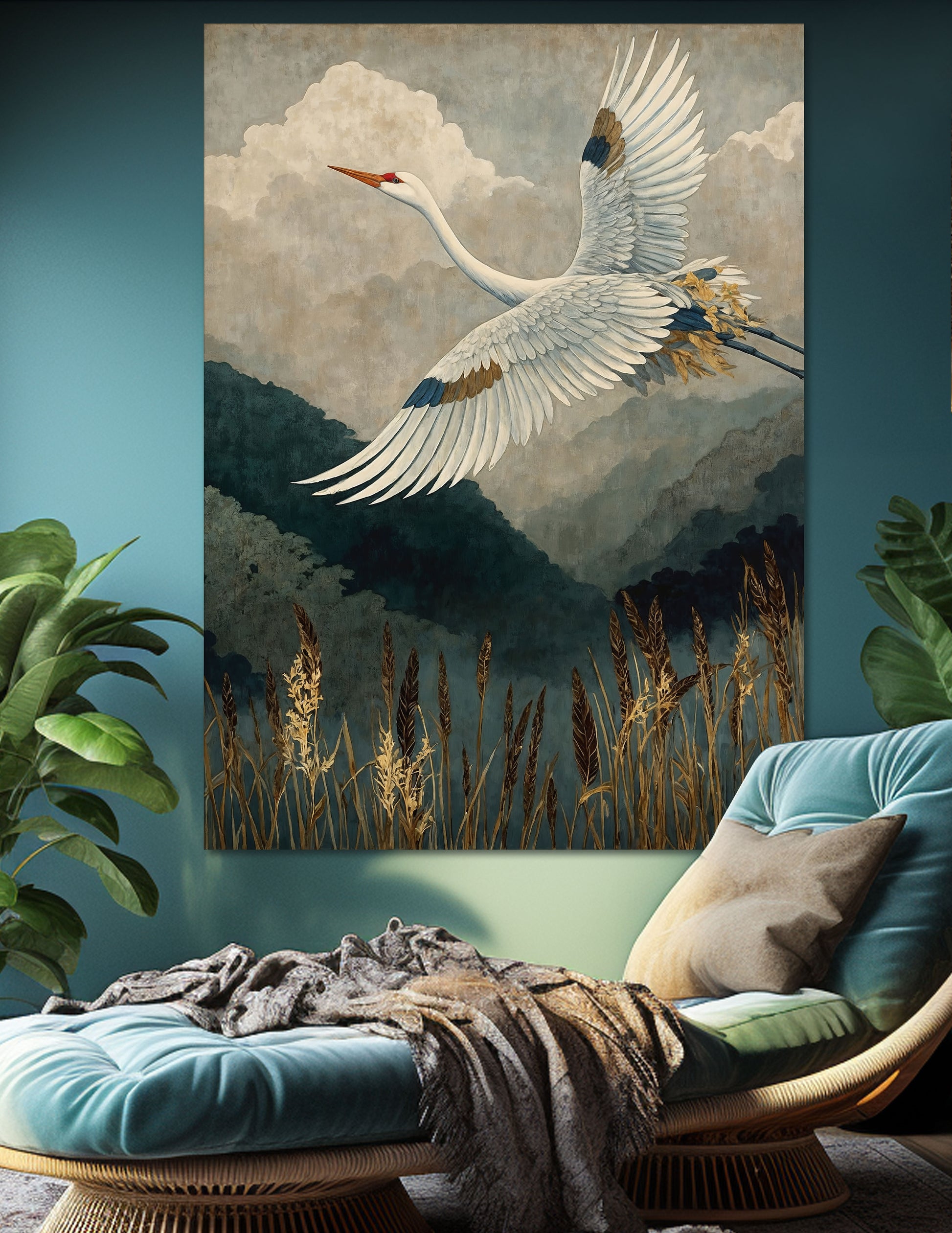 Vintage inspired art piece of a white crane with a mountain range in the background.