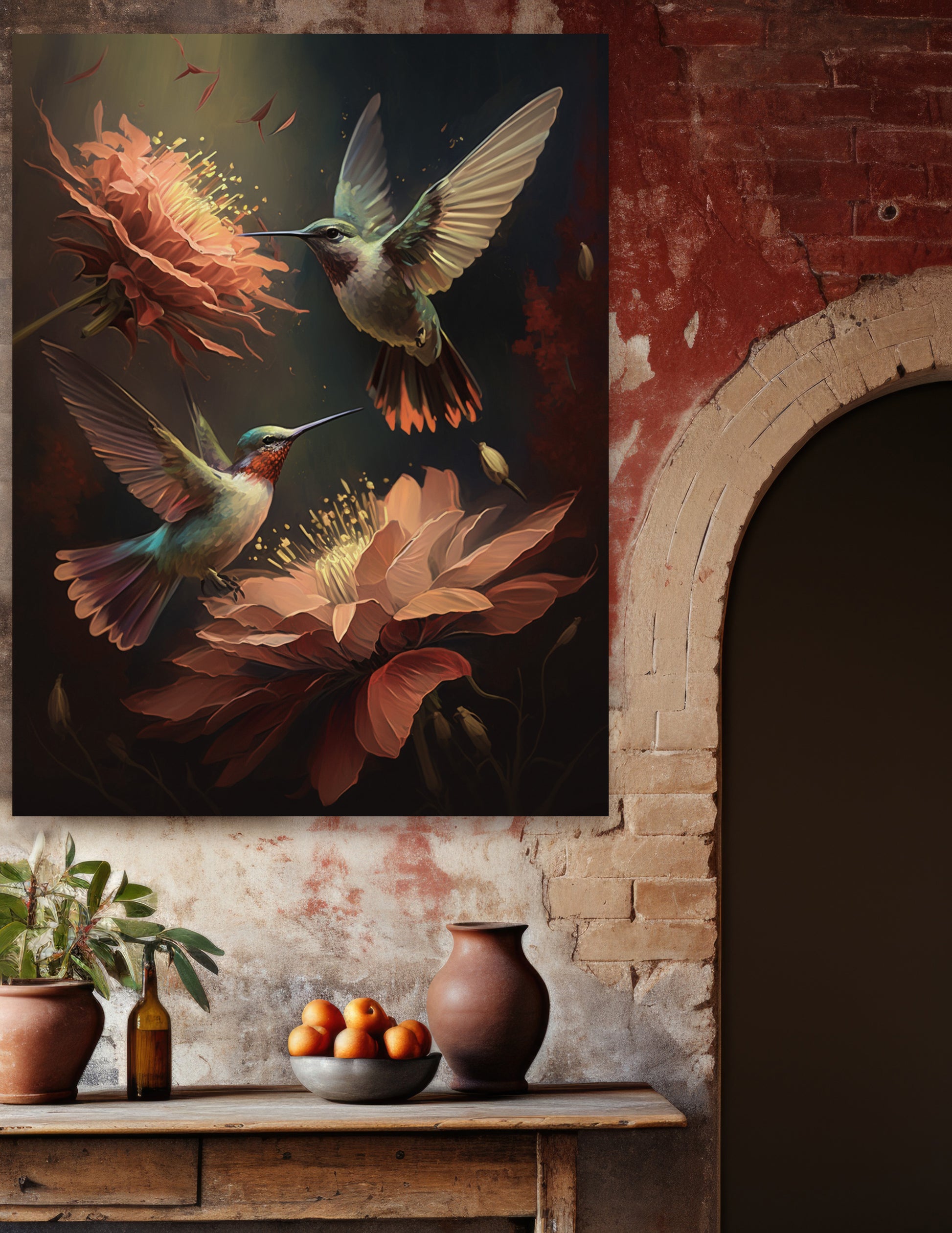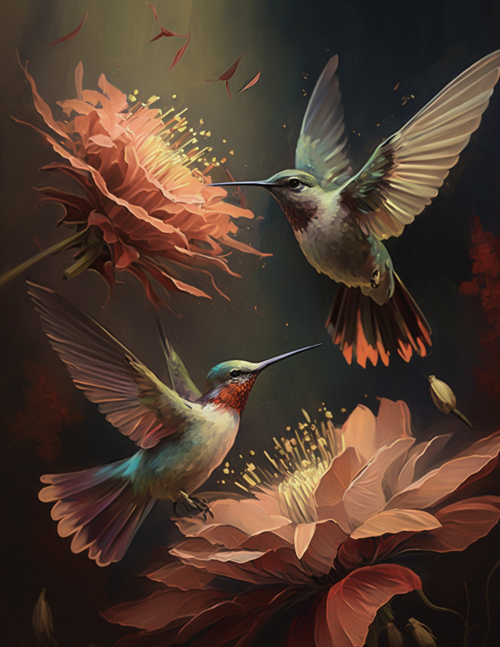Vintage inspired art piece of Sunbirds with flowers