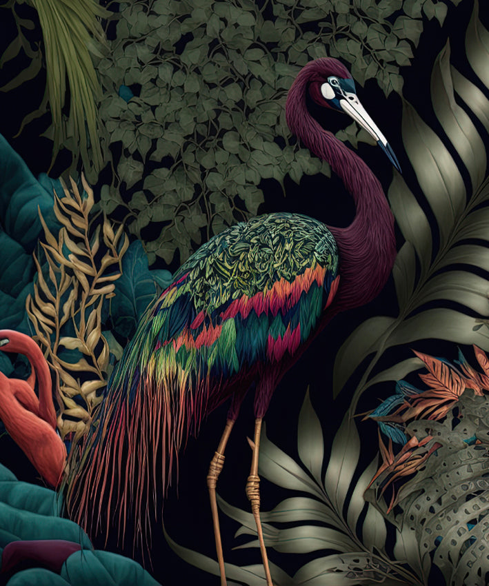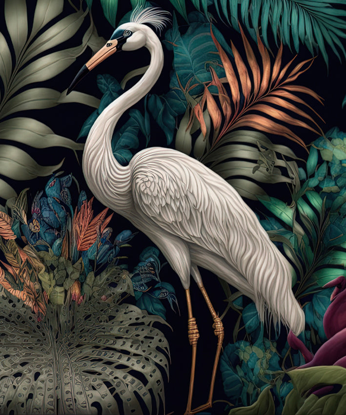 This striking set vintage boho prints of birds in tropical scene is available as a stretched, block mounted canvas, framed or unframed and prepared range of sizes.