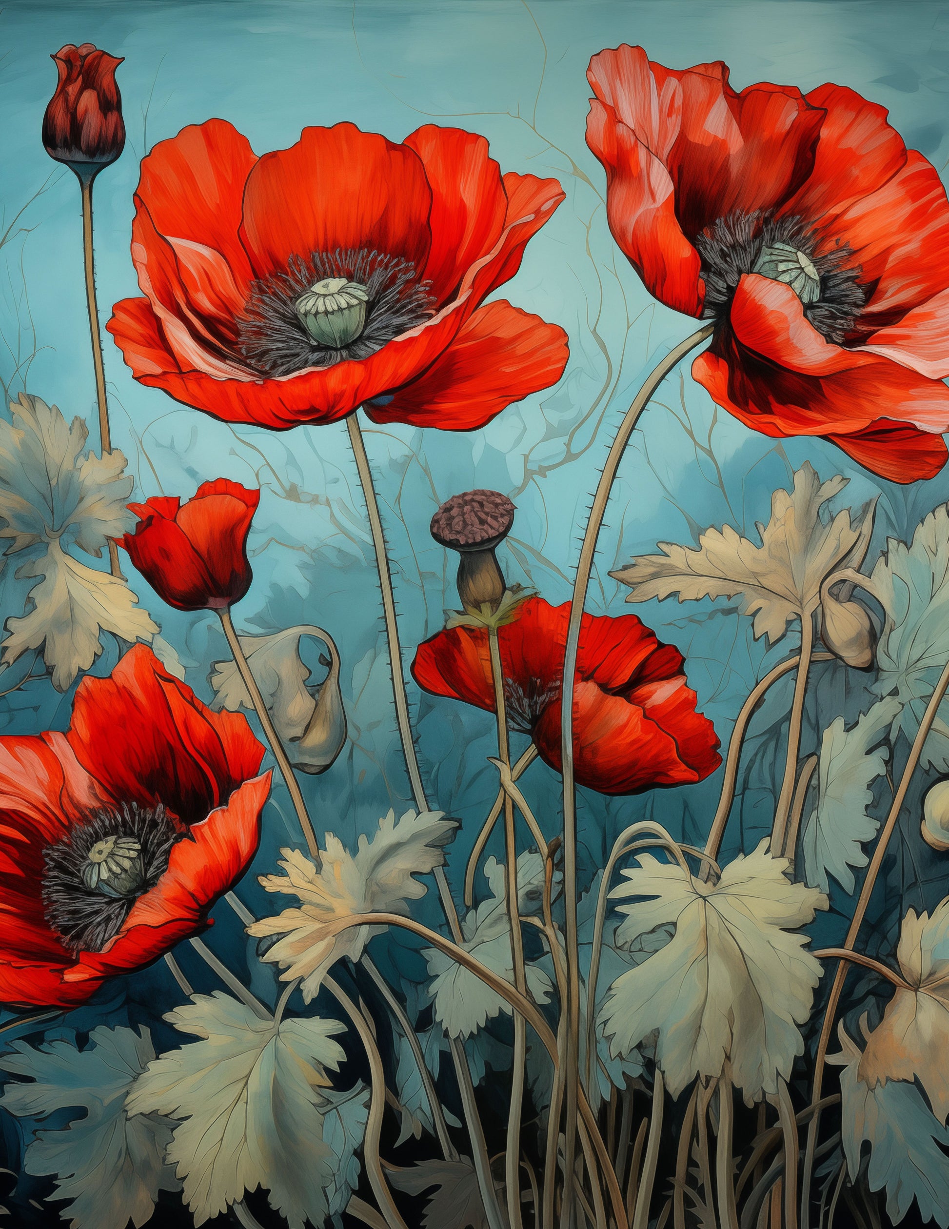 Vintage Bohemian art piece of red poppy flowers with dramatic backdrop.