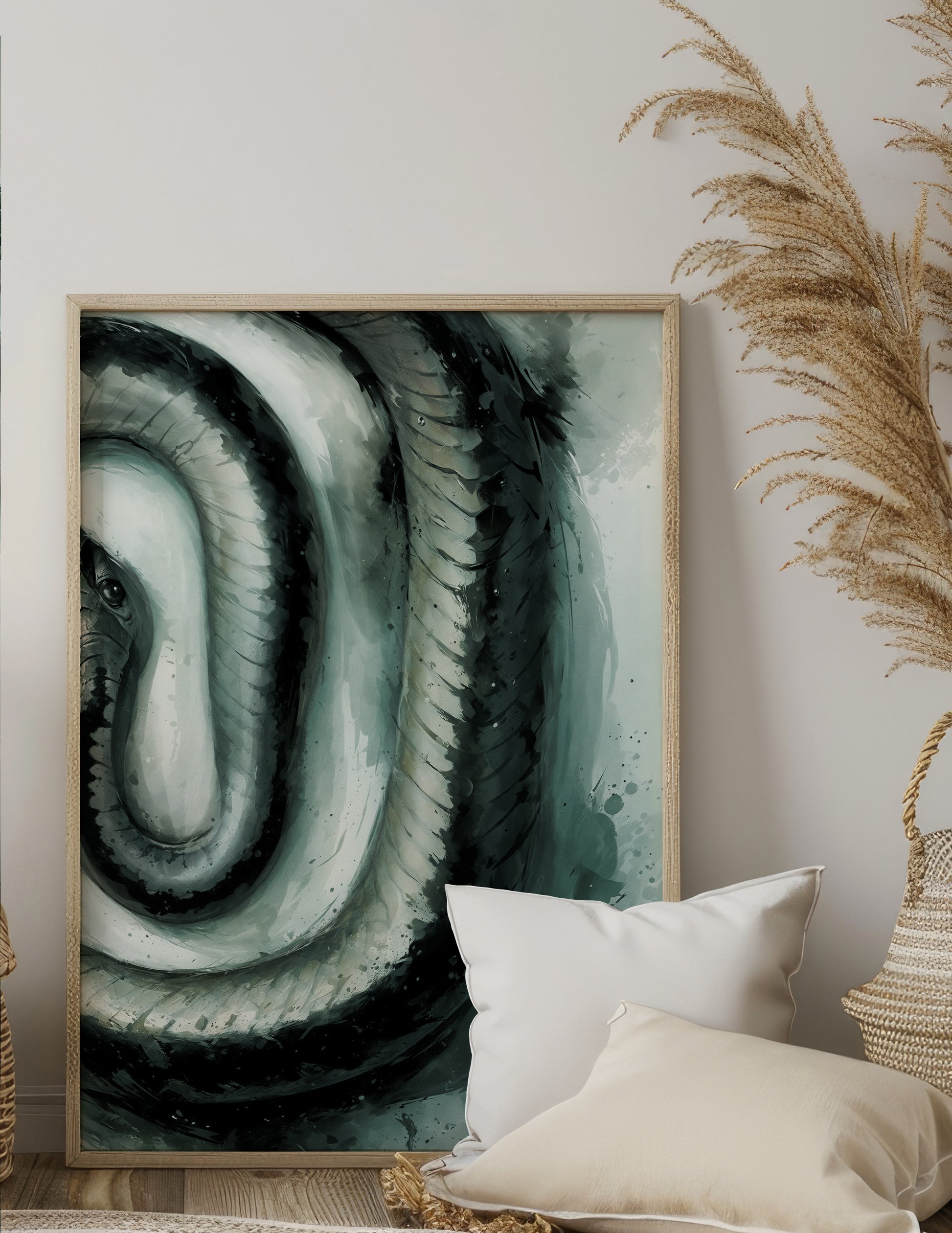 Striking close of art piece snake, in tones of blue and greens.
