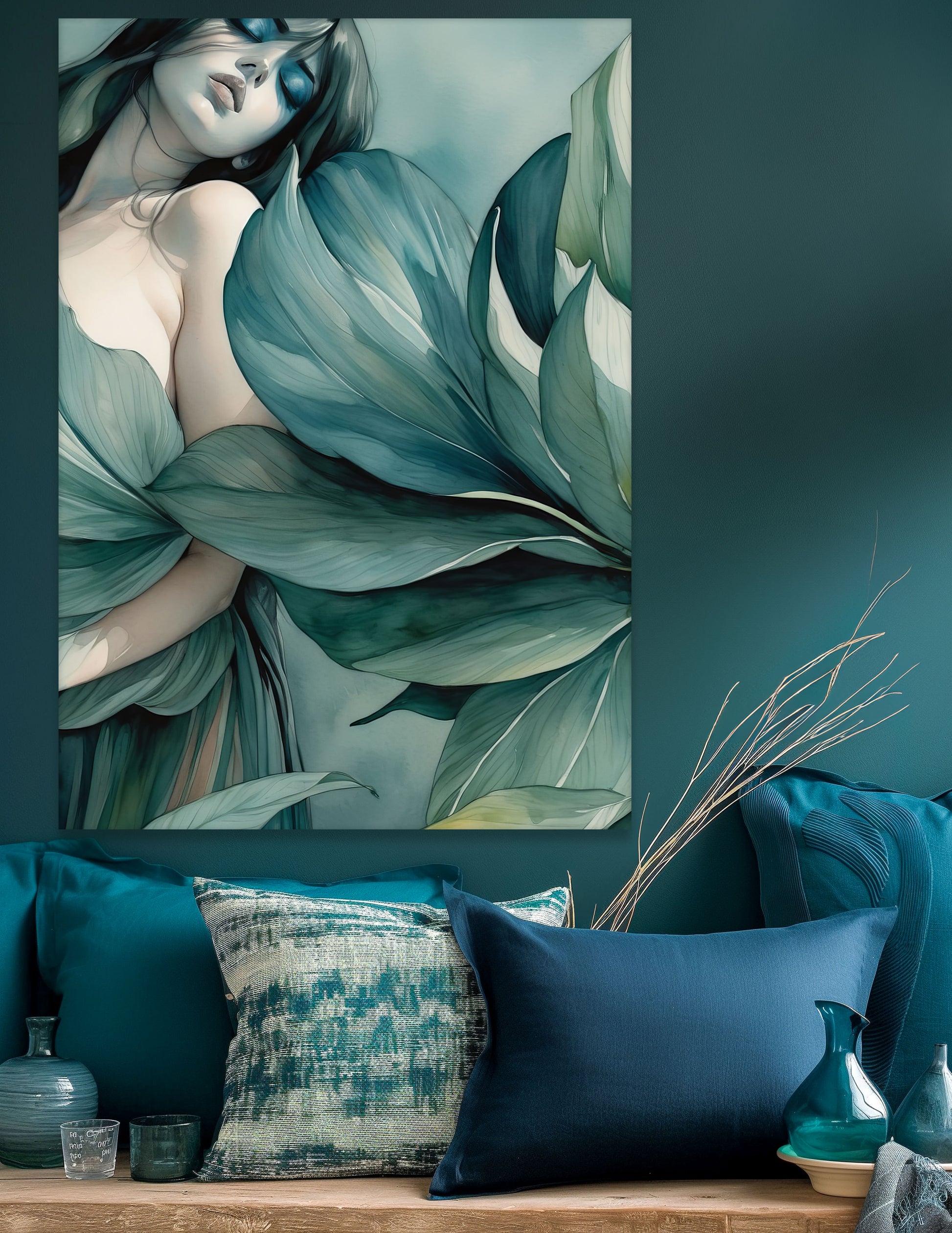 Soft Bohemian art piece of beautiful woman surrounded in soft florals in tones in blues & greens.